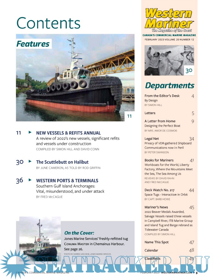Year: 2023 Language: english Author: Somon Hill (Editor) Genre: Periodical (magazine) Edition: 2023-02 Format: PDF Quality: eBook Pages count: 56 Description: We reach more than 20,000 print and e-readers every month: vessel and fleet owners, boat builders and repairers, captains and crews on tugs, crew boats, ferries, workboats, fishing vessels and the businesses and people who support and supply them. Our writers and editors travel the coast to provide informative feature articles on the working waterfront. Our columnists offer insights into marine legal issues, ports and terminals, and entertainment and education for marine professionals.