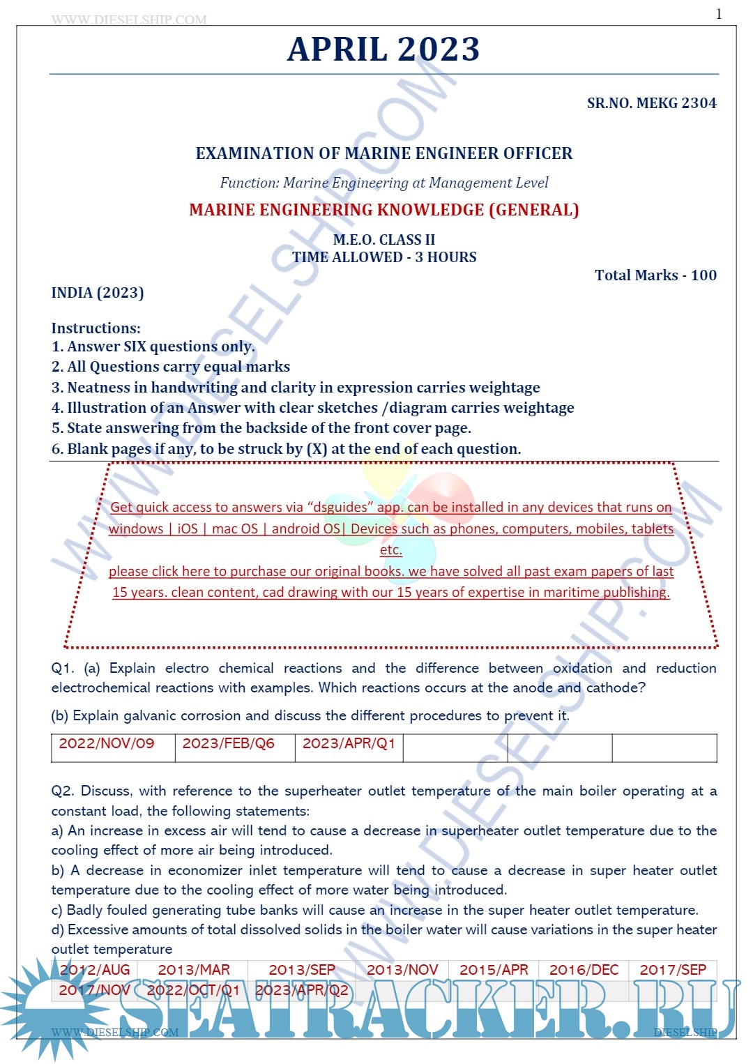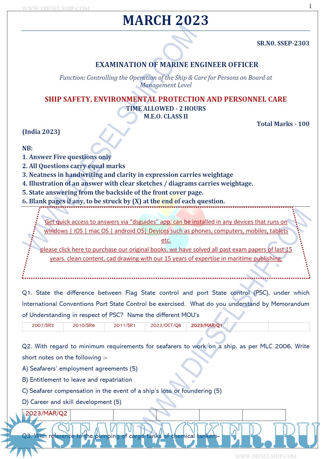 Year: 2023 Language: english Author: Dieselship Format: PDF Quality: eBook Pages count: Multiple Description: M.E.O. Class II Question Paper set for Mercantile Marine Department (MMD), D.G. Shipping India Exams.