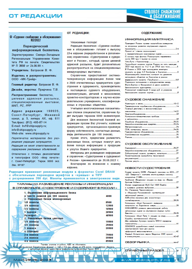 Описание: "Судовое снабжение и обслуживание" - периодический информационный бюллетень, издается с 1999 года и в настоящее время по праву занимает одно из ведущих мест среди специализированных отраслевых печатных изданий.Бюллетень стал надежным маркетинговым инструментом для технического менеджмента судостроительных, судоремонтных и снабженческих компаний. Более 500 отечественных и зарубежных фирм рекламодателей успешно сотрудничают с журналом с целью расширения своего бизнеса.Бесспорным преимуществом является бесплатное распространение издания целевой адресной рассылкой: судостроительным и судоремонтным предприятиям; морским и речным портам; судовладельцам морского, речного, промыслового флота; производителям и поставщикам судового оборудования, снабжения и материалов; предприятиям обслуживания флота (всего более 9000 компаний РФ).В журнале представлен весь спектр судового оборудования, комплектующих, запчастей, снабжения и материалов (с указанием контактных данных фирм производителей и поставщиков).