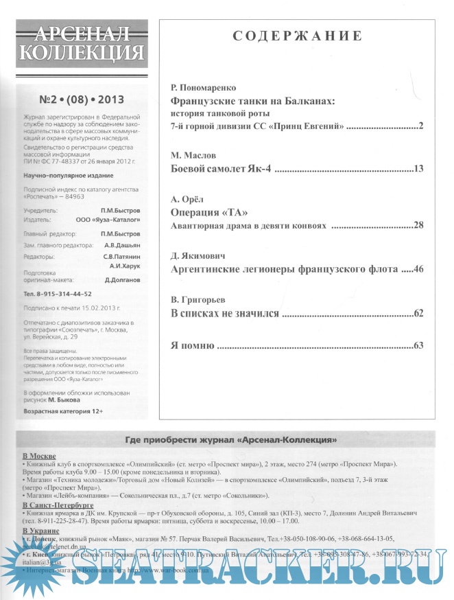 Описание: «Арсенал-Коллекция» - ежемесячный научно-популярный, военно-исторический журнал. Журнал о военной технике - кораблях, авиации, танках, а также о великих сражениях и военных операциях. История изобретения, описание самых удачных операций, побед и поражений – вот что ждет читателей на страницах издания. Красочные обзоры, схемы, фотографии точно не оставят вас равнодушными. Объем ~ 68 страницы, разбитые примерно поровну на три блока - сухопутный, авиационный и морской.