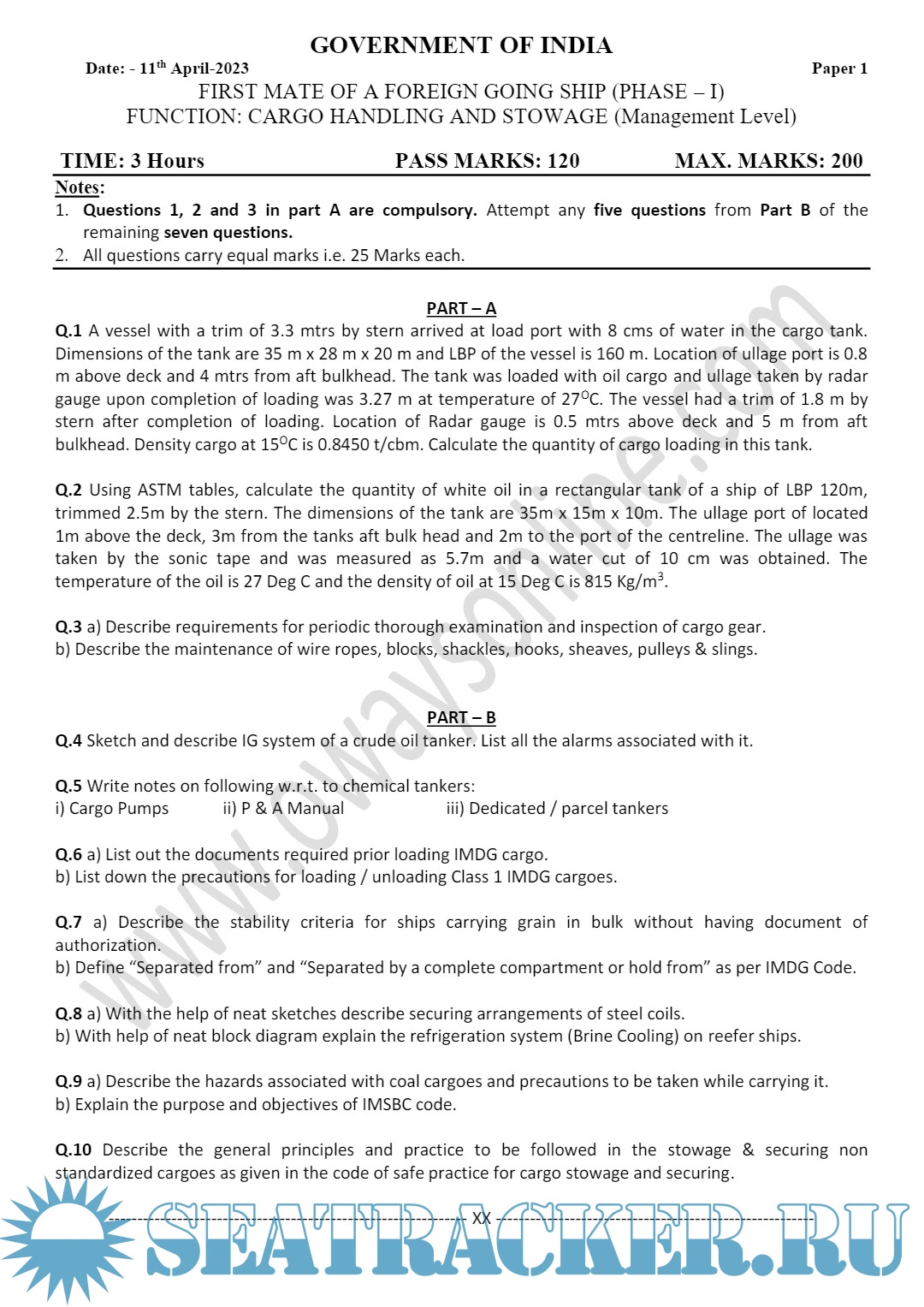 Question Paper Set (July 2023) for Phase I (Chief Mate F.G.) Mercantile Marine Department (MMD), India Examinations