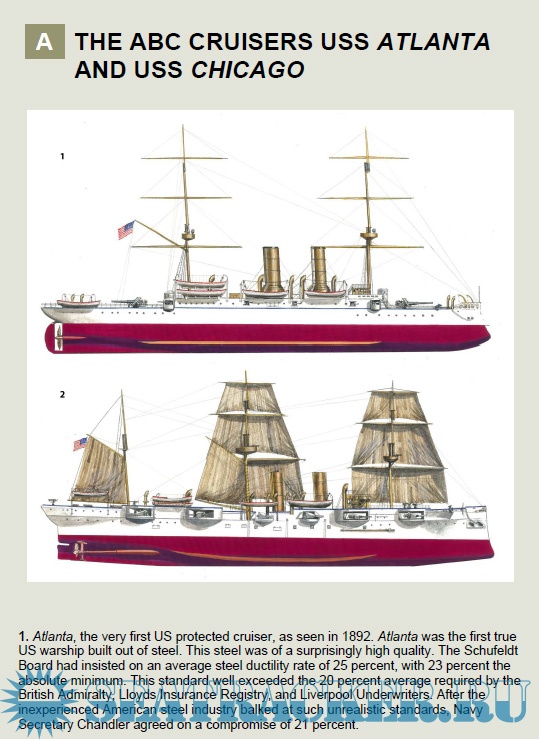 After the American Civil War, the powerful US Navy was allowed to decay into utter decrepitude, and was becoming a security liability. In 1883, Congress approved four new steel-constructed vessels called the “ABCD” ships. The three protected cruisers Atlanta, Boston, and Chicago were the first steel warships built for the US Navy, whose 1880s–1890s technological and cultural transformation was so total it is now remembered as the “New Navy”. This small fleet was joined by a succession of new and distinctive protected cruisers, culminating in the famous and powerful Olympia. These 11 protected cruisers formed the backbone of the early US steel navy, and were in the frontline of the US victory in the 1898 Spanish-American War. It was these warships that fought and won the decisive Battle of Manila Bay. These cruisers also served faithfully as escorts and auxiliaries in World War I before the last were retired in the 1920s.