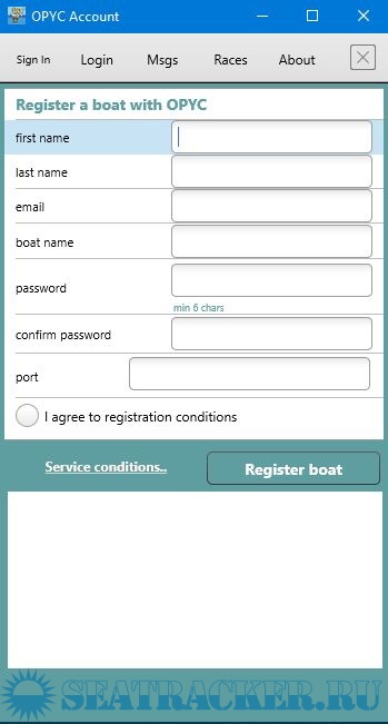 On first use, register a boat name and password in the app. Choose a port to start from.