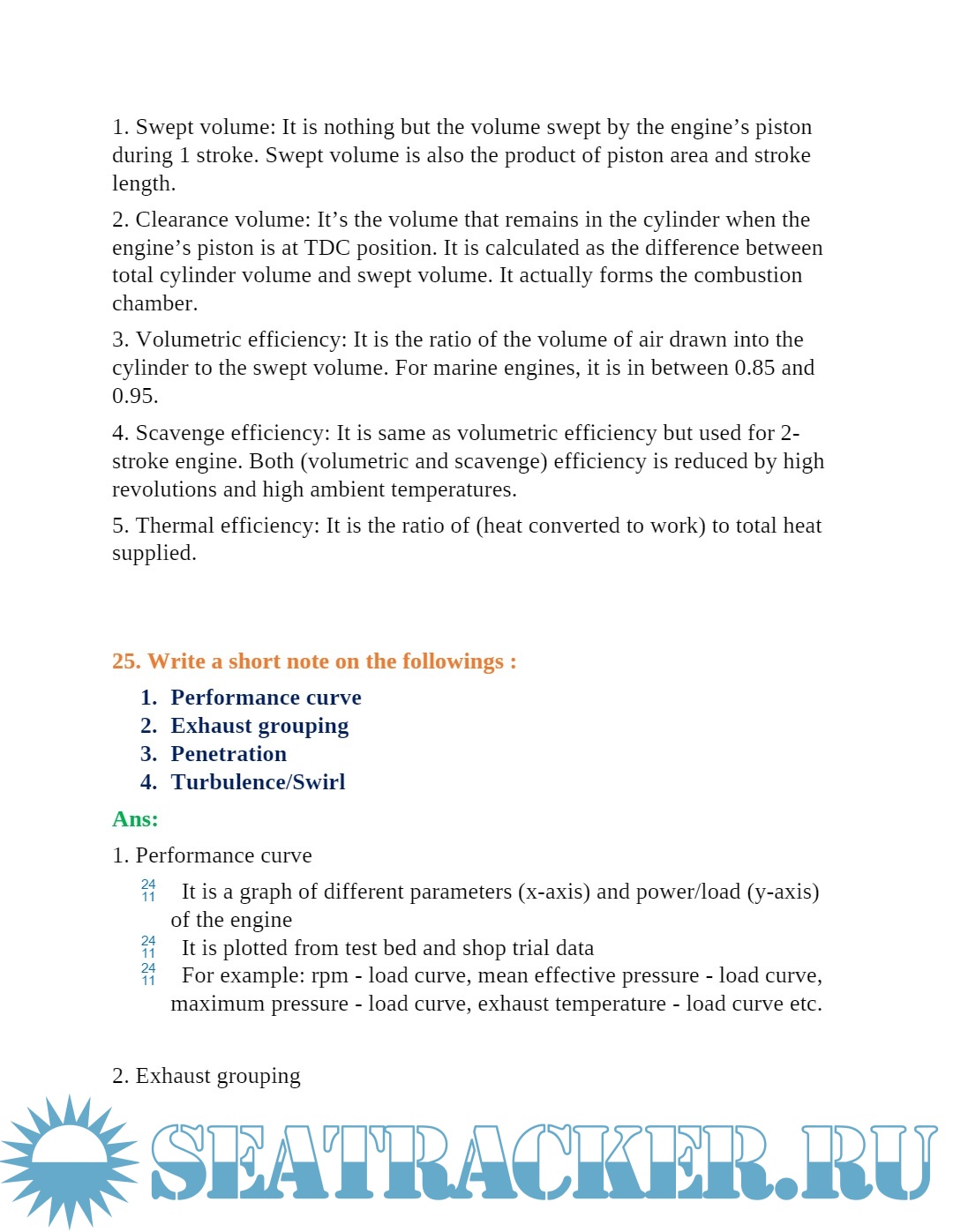 It contains questions and simple answers on various topics like 2-stroke slow speed marine diesel engine, scavenging, turbocharging, fuels, lubrication and basics of troubleshooting etc.