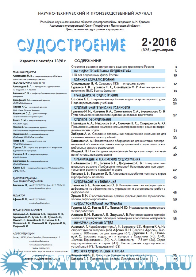 Журнал «Судостроение» №827 июль-август - Горелов В.В. (зам. главного редактора) [2016, PDF]