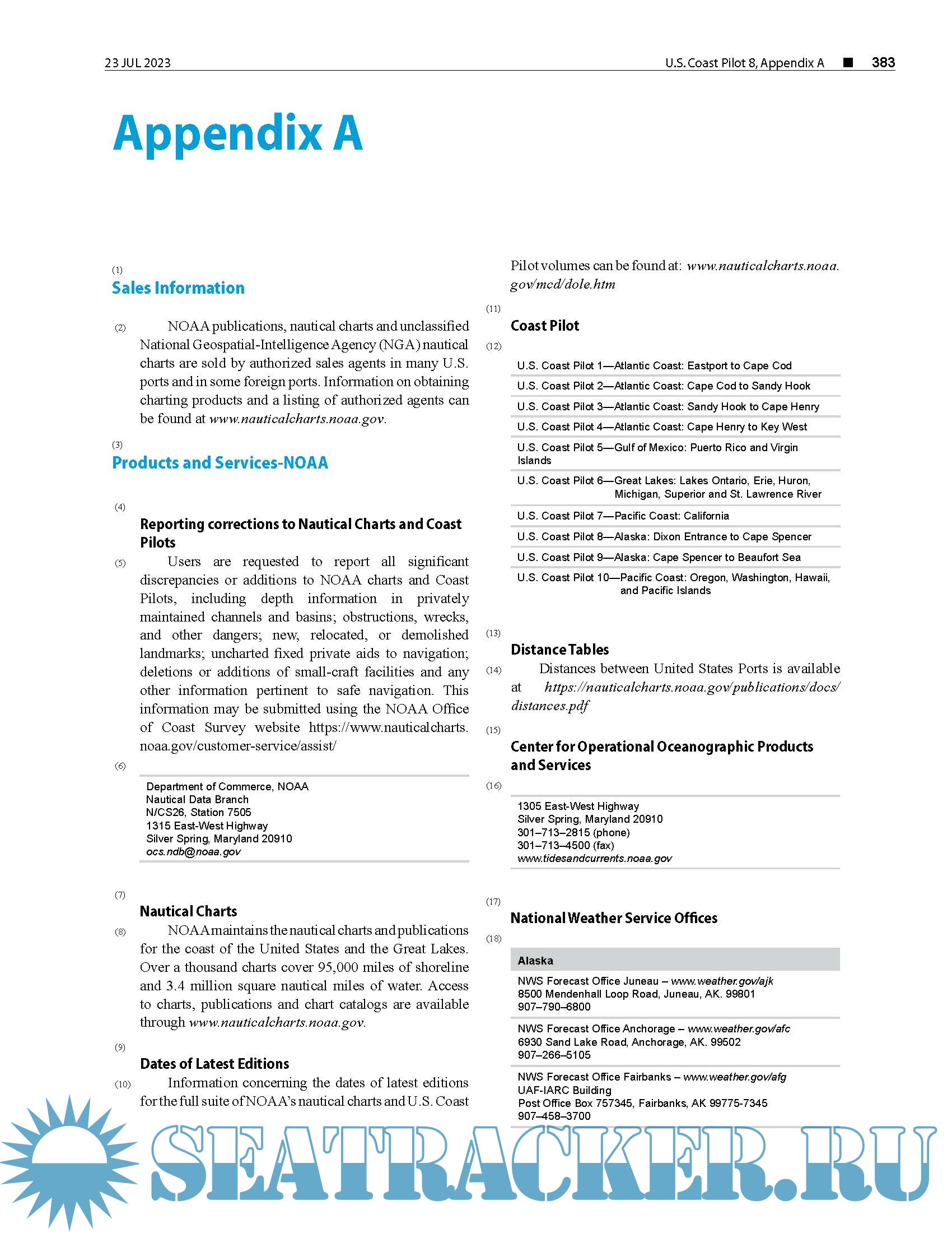 Year: 2023 Language: english Author: NOAA Genre: Documentation Edition: 2023 (45th) Edition Format: PDF Quality: eBook Pages count: 418 Description: The United States Coast Pilot, published by the National Oceanic and Atmospheric Administration(NOAA), is a series of ten nautical books (volumes) that encompasses a wide variety of information important tonavigators of U.S. coastal/intracoastal waters and the waters of the Great Lakes. The Coast Pilot is intended tobe used as a supplement to NOAA nautical charts. Much of the content cannot be shown graphically on the chartsand is not readily available elsewhere. Topics which are covered include environmental factors of weather, climate,ice conditions, tides, water levels, currents, prominent coastal features and landmarks. Specific informationon vertical clearances, wharf descriptions, small-craft facilities, hazards, dredged channels and depths are alsoprovided. Navigation services and regulations are also identified including pilotage, towing, anchorages, routesand traffic separation schemes, environmental protection, and other Federal laws. Updated upto 23 July 2023