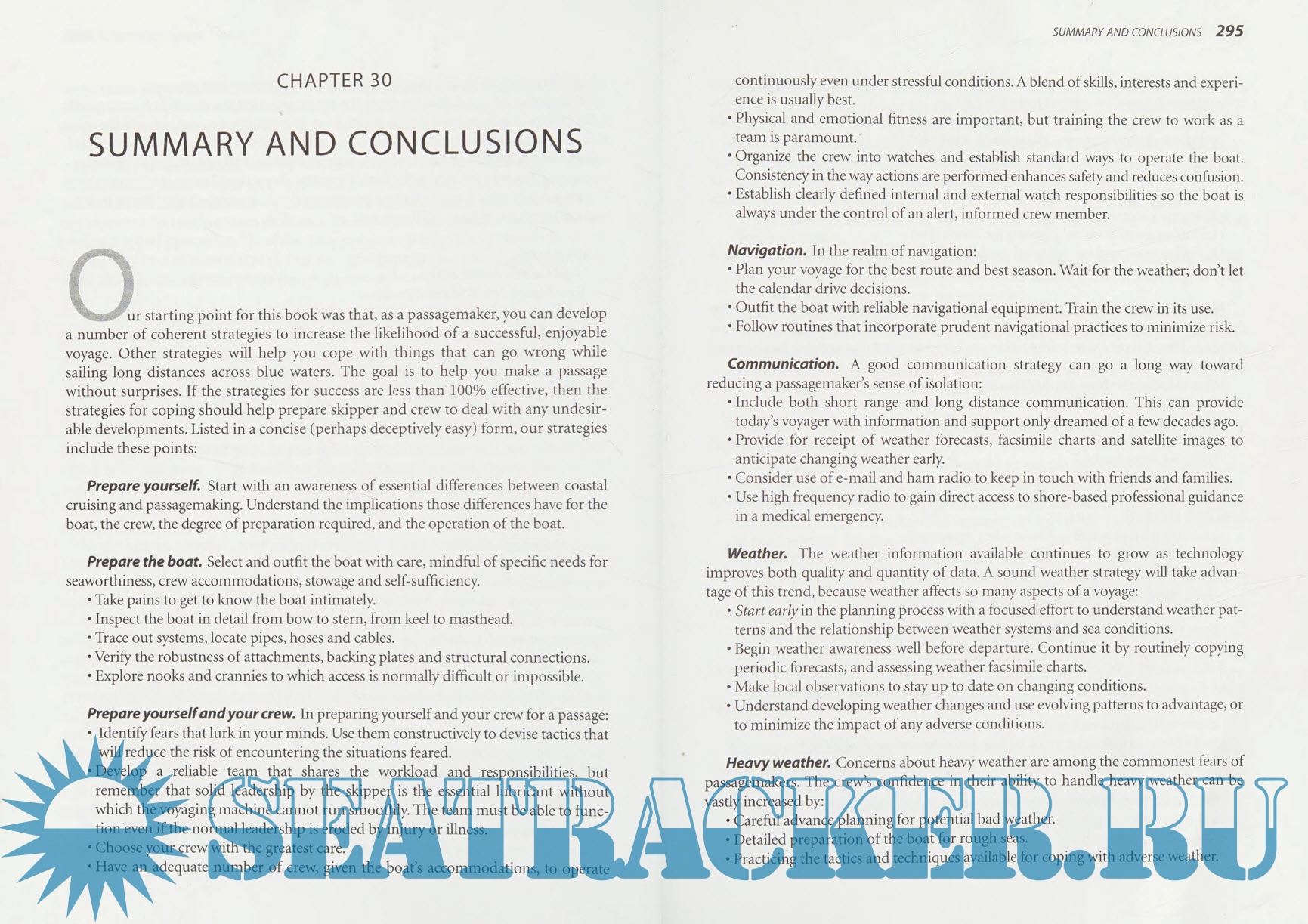 Year: 2001 Language: English Author: Hal Sutphen Genre: Handbook Publisher: Cruising Rally Association Edition: First ISBN: 978-0970456007 Format: PDF Quality: Scanned pages Pages count: 320 Description: A ocean cruising handbook, Advanced Bluewater Cruising provides a comprehensive guide for coastal cruising sailors wishing to make the step up to ocean cruising. In an easy-to-use format, Advanced Bluewater Cruising first outlines key differences between coastal and offshore cruising, offers some sound criteria for selecting a boat, and presents the pros and cons of major equipment options. Following chapters include such practical topics as voyage planning, fear as a guide to action, the skipper as leader, crew responsibilities and routines, watchstanding, managing personal affairs (mail, money, bills, emergency contacts), provisioning, stowage and cooking, medical preparedness and more. The weather and up-to-the-minute communications sections will help in interpreting weather systems and in using today's onboard communications tools to get the best forecast information. Sail selection, care and trim chapters will prove useful both before and during ocean passages. The first two-thirds of the book set forth practical steps to successful passagemaking under sail. The remaining third presents methods of coping with adversity in various forms: heavy weather, illness and injury, dismasting, fire, flooding, with specific sections on troubleshooting your engine, your steering and your electrical system. Illustrated, and with radio frequency lists, watchstanding schedule options, medical prescription information and more. Additional info: The book is intended primarily for newer bluewater cruising sailors. It will prove useful as well for more experienced offshore cruising sailors. It is a great presentation of all the fundamentals that every sailor should know before heading out on an offshore passage. And there is much up-to-the-minute information on this ever-changing subject.