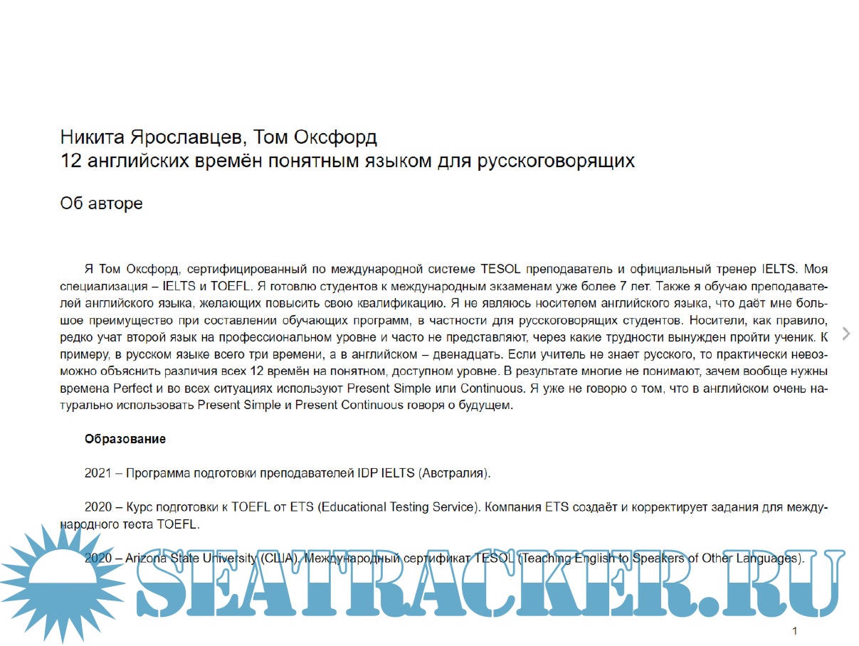 Год выпуска: 2023 Язык: Русский, Английский Автор: Том Оксфорд, Никита Валерьевич Ярославцев Жанр: Учебное пособие Формат: PDF Качество: Изначально компьютерное (eBook) Количество страниц: 77 Описание: Я Том Оксфорд, сертифицированный по международной системе TESOL преподаватель и официальный тренер IELTS, профессионально преподаю английский с 2009 года. В процессе работы, я заметил, что 9 из 10 русскоговорящих учеников не умеют пользоваться двенадцатью временами английского языка. Даже прочитав правила, они не понимают, как это делать. Проблема в том, что стандартные объяснения, изложенные в учебниках, часто не адаптированы под родной язык ученика. В результате увидев предложение: I’m tired because I’ve been working hard this week (Я устал, т. к. работал усердно на этой неделе), студенты просто “бросают язык”, не понимая, почему здесь используется Present Perfect Continuous, а не Past Simple или Past Continuous. В этой книге я объясняю все 12 времён, учитывая особенности русского языка. Прочитав эту книгу, вы сможете понять, как они используются, и начнете говорить правильно. А самое главное – лучше понимать носителей.