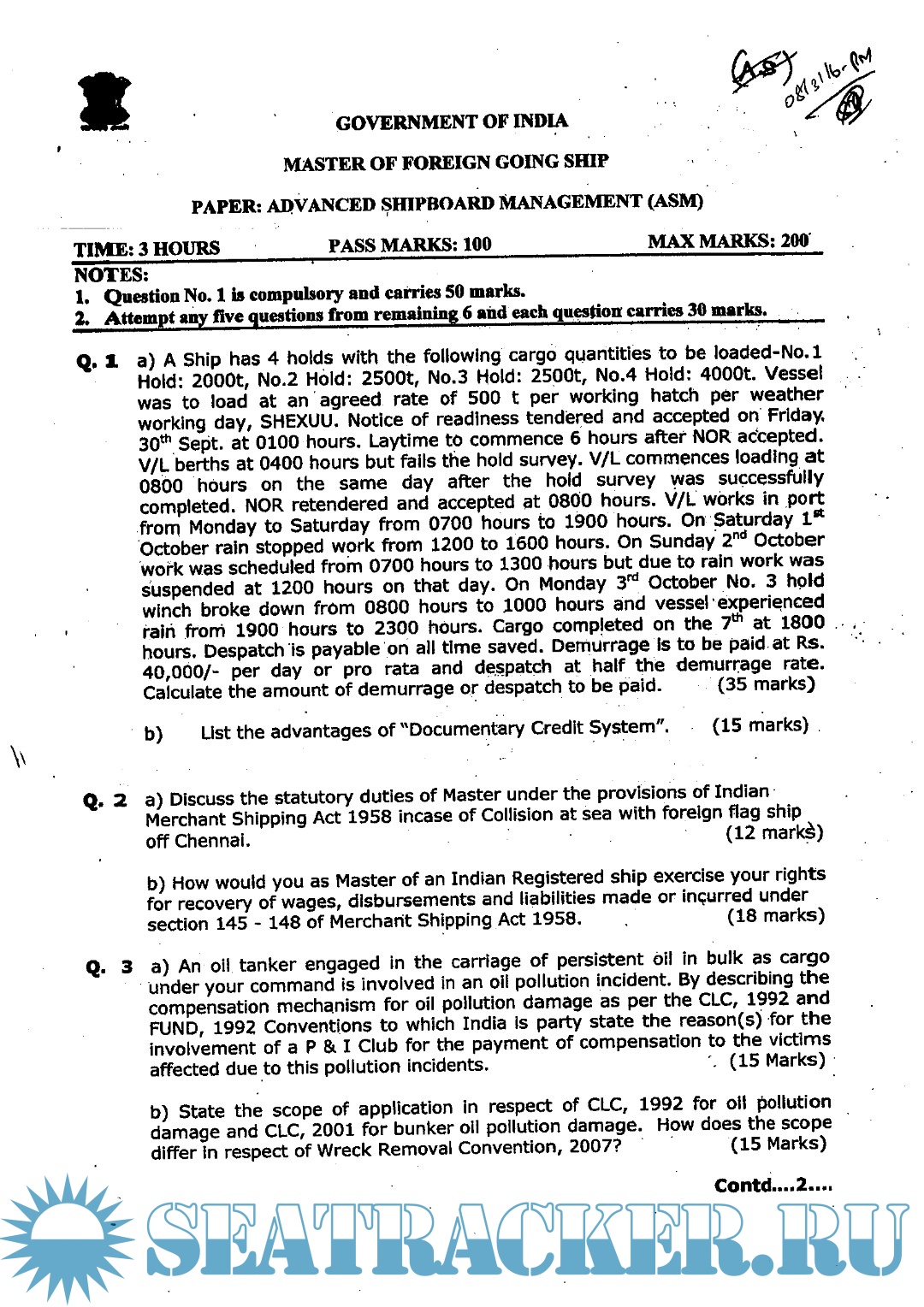 Question Paper Set for (ASM) Advanced Shipboard Management (July 2023) for Master's Examinations, Mercantile Marine Department (MMD), India