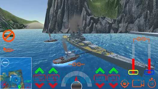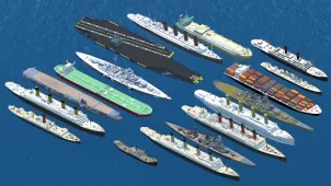 Realistic control of cruise liners, cargo ships, warships, including aircraft carriers from 19th century steamers till modern nuclear.