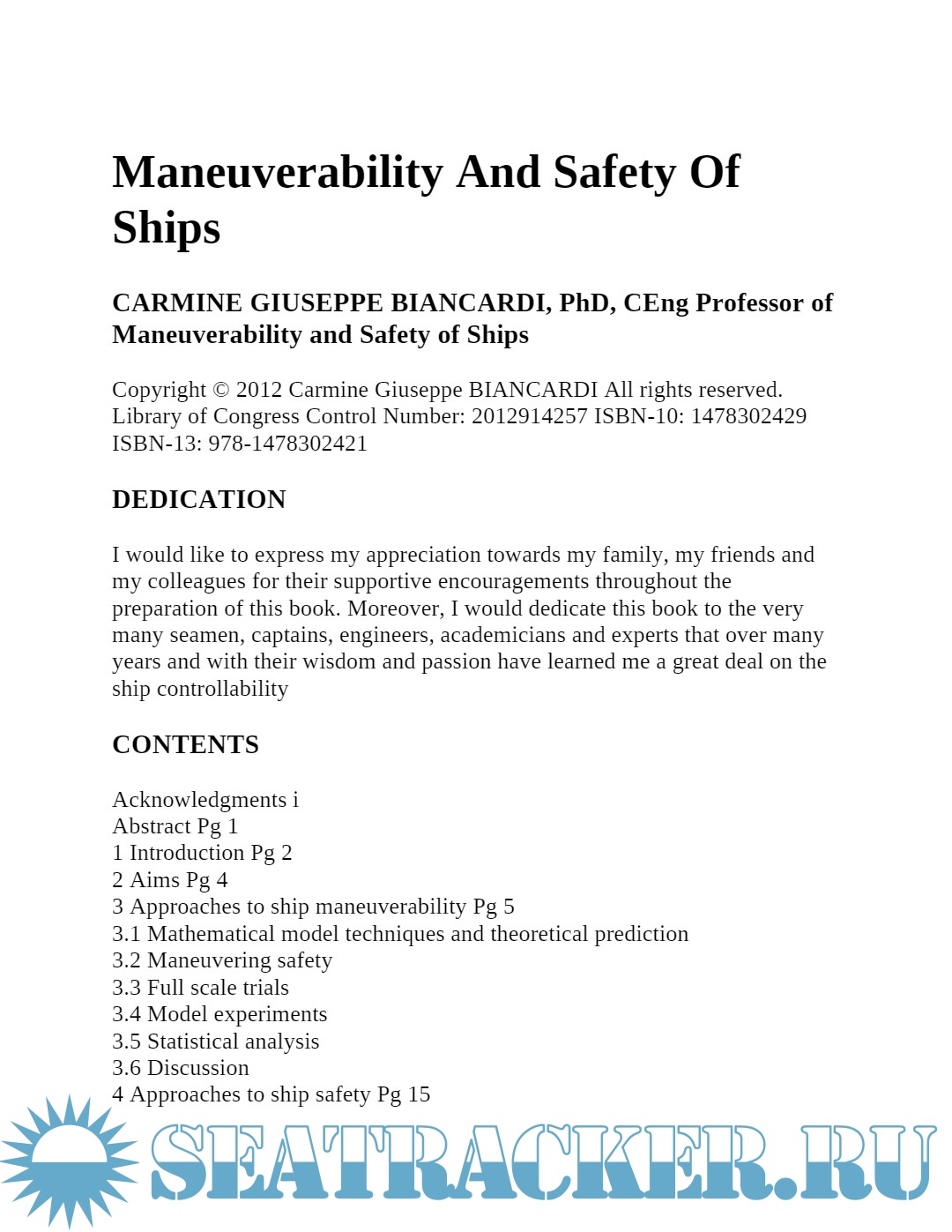 Year: 2012 Language: english Author: Carmine Biancardi Publisher: STR Europe Edition: Kindle ISBN: 978-1478302421 Format: PDF Quality: eBook Pages count: 187 Description: This book delivers a strong tool for understanding ship maneuverability and controllability and its links to Safety. If from one side the writing style is educational and with a clear engineering focus, this book is also a support for the Naval Architect and the Ship Designer as well as for the Operator willing to improve the design, the building and the operational safety of new and existing ships. The book is recommended for the academia, the student, the naval architect, the engineer and the designer, as well as for people interested in ship maneuvering ad its links with safety. The book begins by performing a critical review of existing approaches for dealing with Ship Manoeuvrability and Ship Safety before considering fresh understandings of these terms. Different attempts to integrate Safety with Manoeuvrability are then examined. The weak features of these attempts are considered and scope for developing fresh approaches is then presented. This is followed by an explanation of alternative new ways of treating a ship's manoeuvrability. In order to meet the requirements for operational specifications and safety in a cost-effective way, the book proposes an approach for relating Safety with Manoeuvrability in the appropriate, and all, phases of a ship's life cycle. The approach is based on a preventive Safety Methodology while introducing fresh, but consolidated, indices and criteria for assessing the ship's manoeuvrability. Two case examples are used to show how the methodology can be readily applied and how it offer an effective approach for designing and operating ships that can meet improved manoeuvring-safety requirements. One case example studies a dry cargo ship while the other studies a service ship.