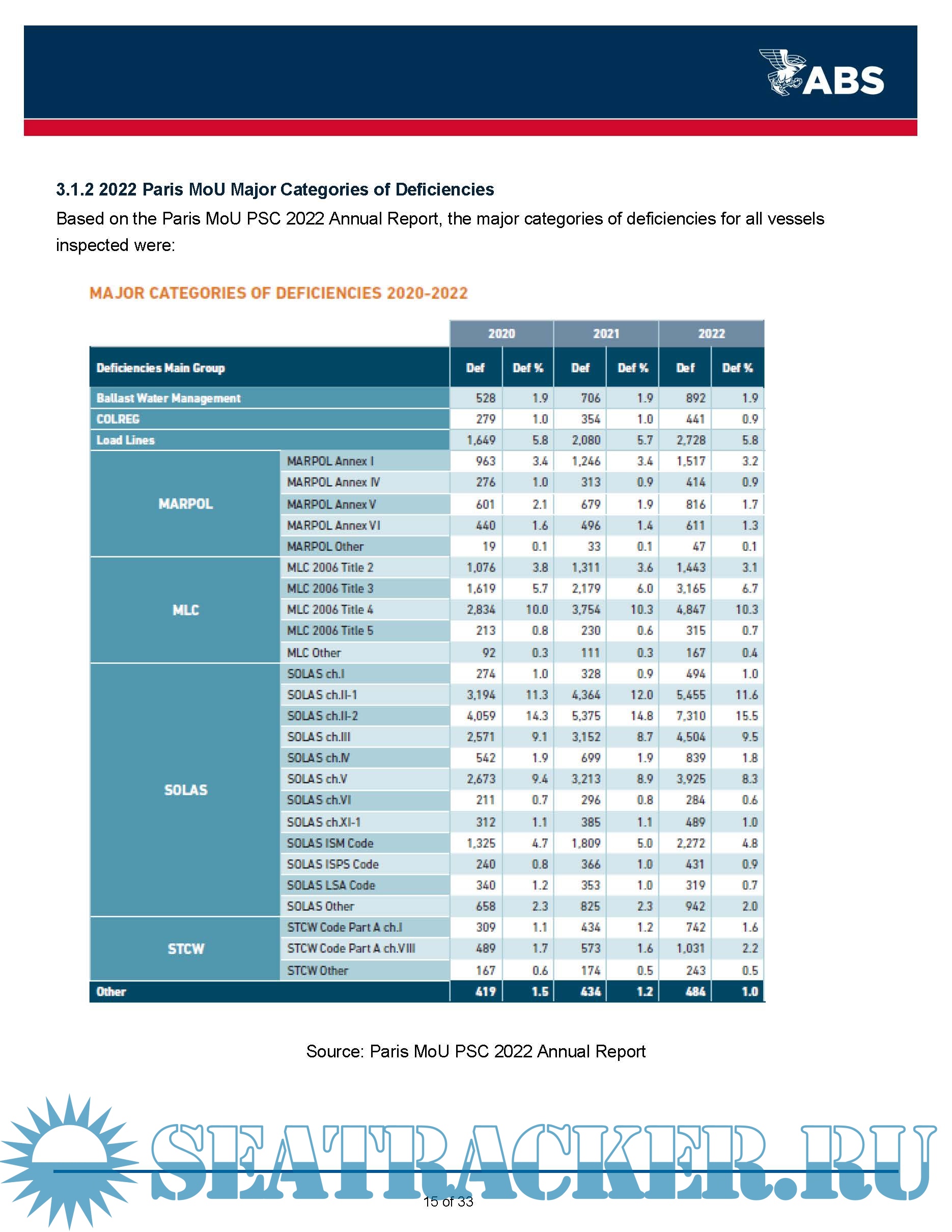 Description: This ABS Annual Report on Port State Control (PSC) provides information to owners on deficiencies identified on ABS vessels during inspections carried out by the various PSC regimes globally during the 2022 calendar year. This report is being made available to assist owners by providing awareness of potential areas of concern that have been identified on ABS classed vessels.