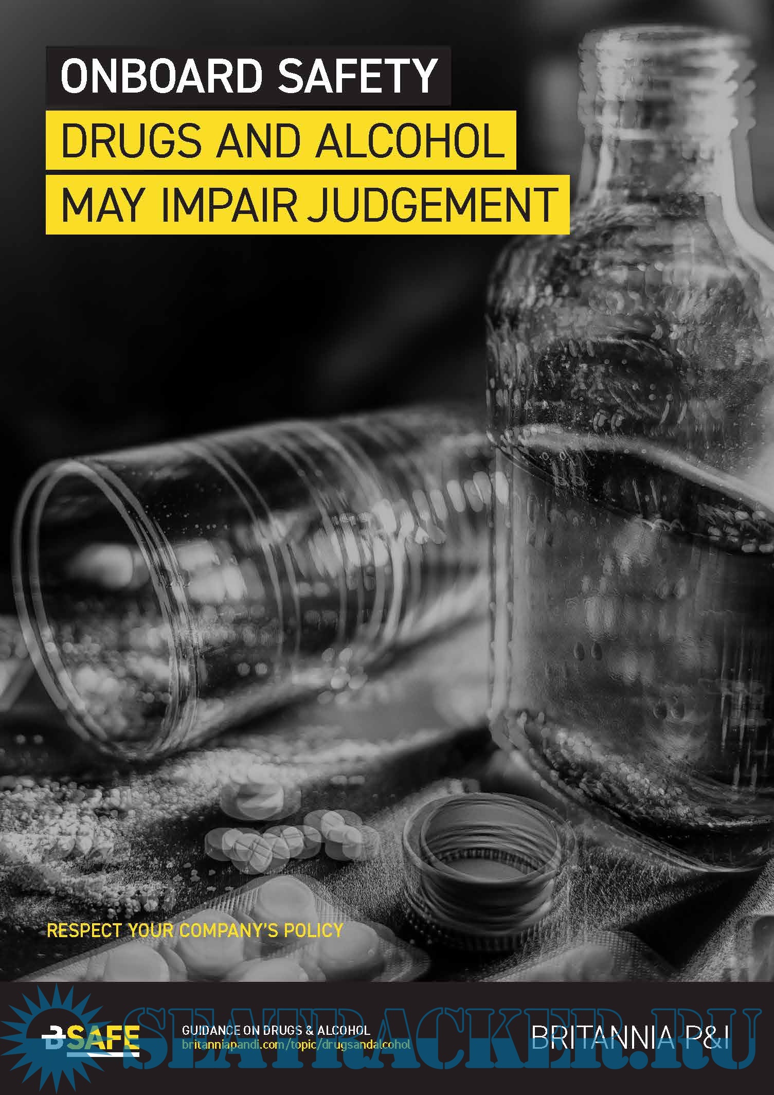 Description: Onboard Safety - Drugs and Alcohol poster published by Britannia P&I Club. Respect your company's policy!