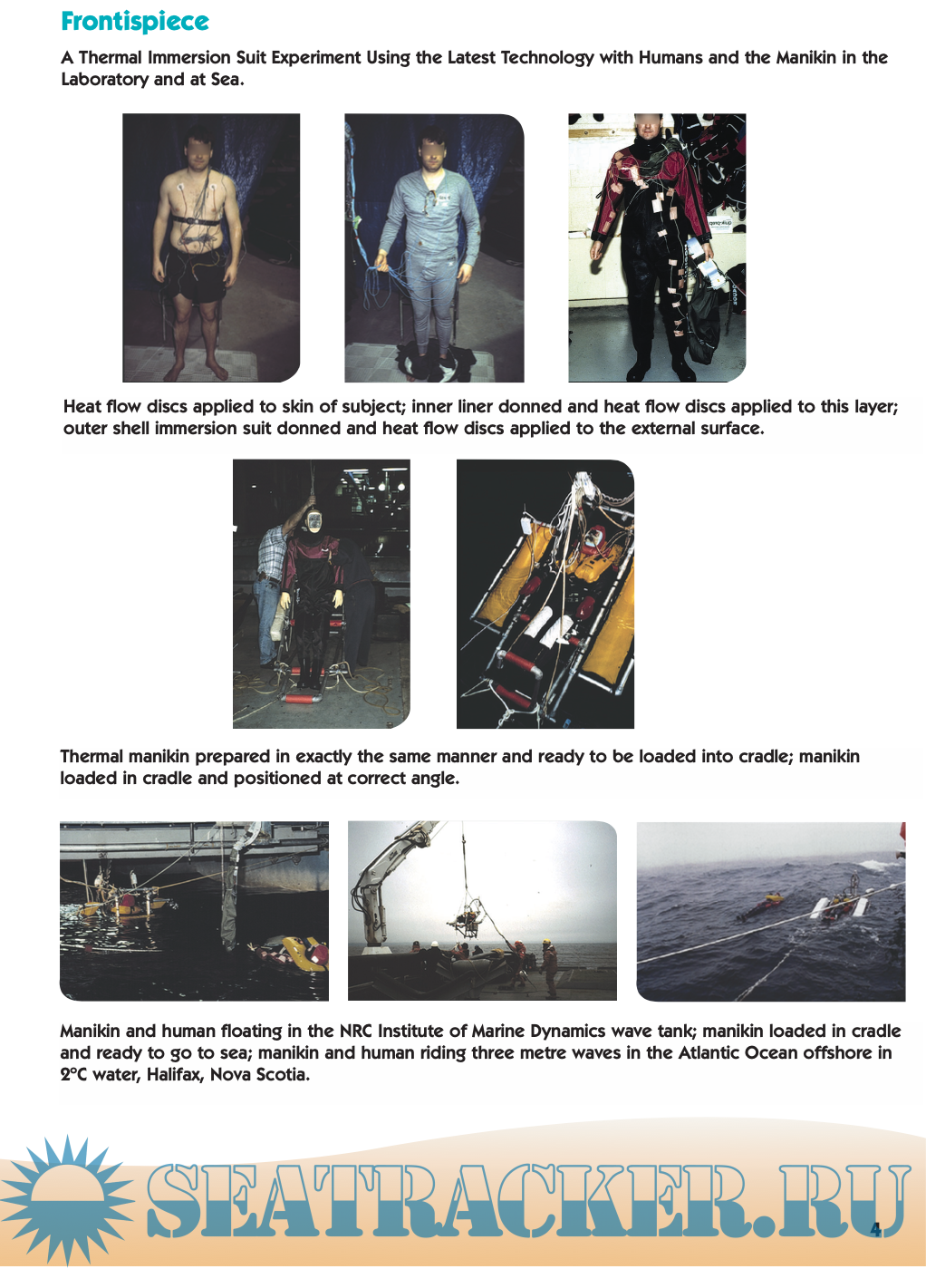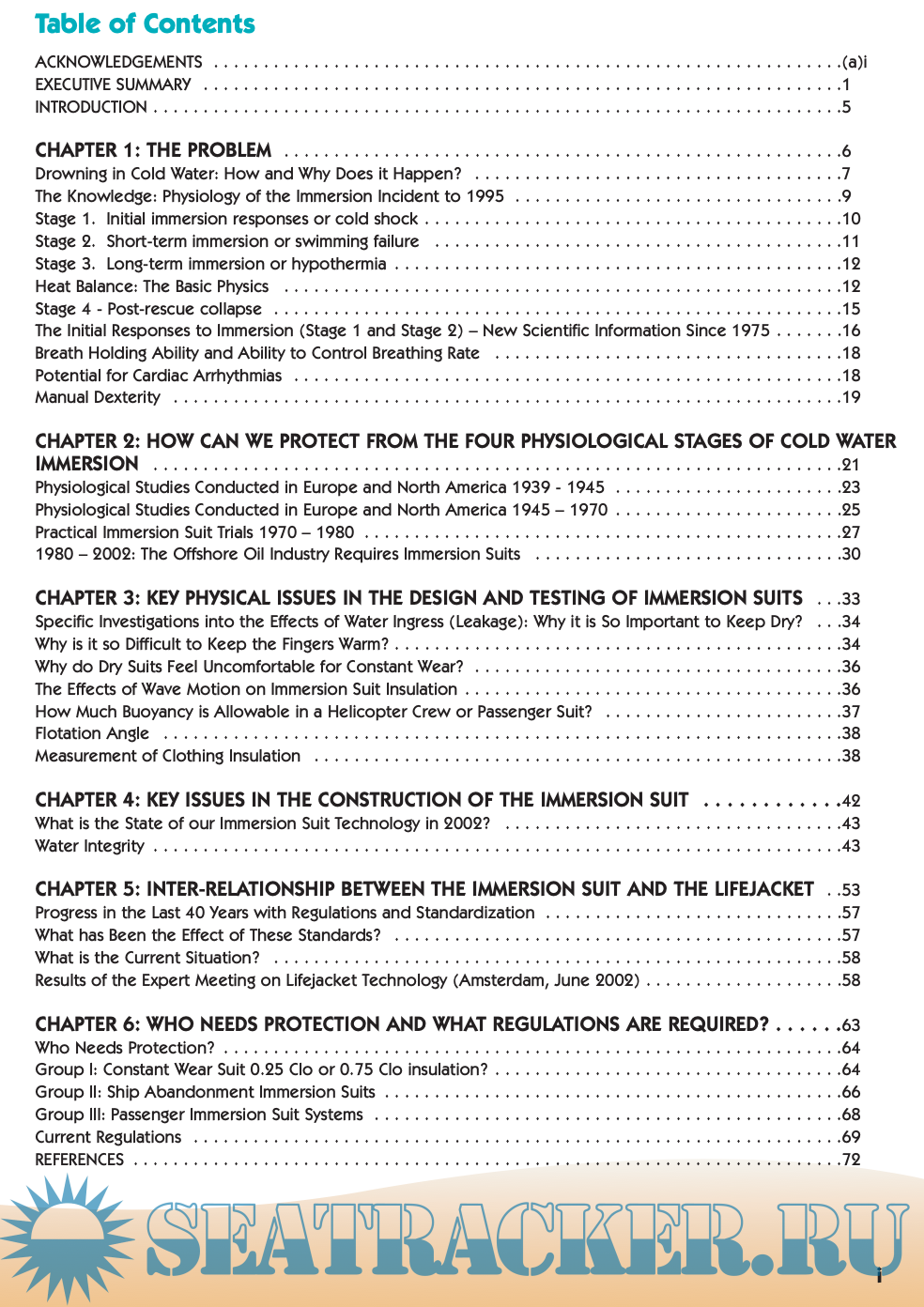 It is divided into six specific chapters: 1) a brief introduction to the problem; 2) the physiology of cold water immersion; 3) the research that has been conducted to protect the human from the dangers of sud- den cold water immersion; 4) the design and development of current immersion suits; 5) the interrelation- ship between the immersion suit and the lifejacket, and 6) a review of the different groups of people who fly over, work on or play on the water and what protection these groups need.