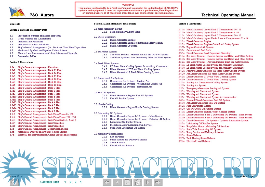 Year: 2001 Language: english Author: WMT Genre: Manual Publisher: P&O Cruises Format: PDF Quality: eBook Pages count: 574 Description: Technical Operating Manual Ship name: AURORA Type: Passenger (Cruise) Ship IMO: 9169524 Company: P&O Cruises The concept of this Operating Manual is to provide information to technically competent ship’s officers who are unfamiliar to the vessel, in a form that is readily comprehensible, thus aiding their understanding and knowledge of the specific vessel. Special attention is drawn to emergency procedures and fire fighting systems. The manual also details the ship’s systems, providing a technical description, system capacities and ratings, control and alarm settings (where practicable) and operating details.