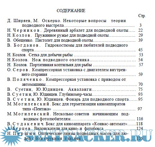 Описание: Книга состоит из 18 статей, каждая из которых посвящена тому или иному предмету из арсенала спортсмена-подводника. Книга содержит большое количество схем, рисунков для подводного снаряжения: акваланги, гидрокостюм, арбалет, пистолет, ружье для подводной охоты, портативная коптильня для копчения рыбы и т.д.