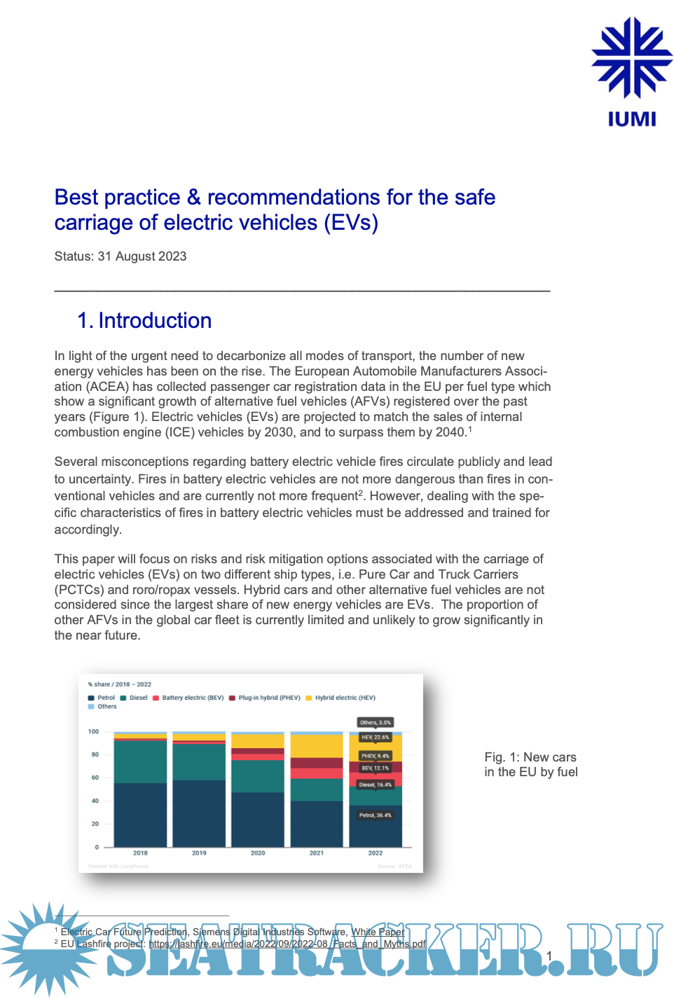Year: 2023 Language: english Author: International Union of Marine Insurance (IUMI) Genre: Guide Publisher: IUMI Edition: 1 Format: PDF Quality: eBook Pages count: 9 Description: This paper will focus on risks and risk mitigation options associated with the carriage of electric vehicles (EVs) on two different ship types, i.e. Pure Car and Truck Carriers (PCTCs) and roro/ropax vessels. Hybrid cars and other alternative fuel vehicles are not considered since the largest share of new energy vehicles are EVs. The proportion of other AFVs in the global car fleet is currently limited and unlikely to grow significantly in the near future.