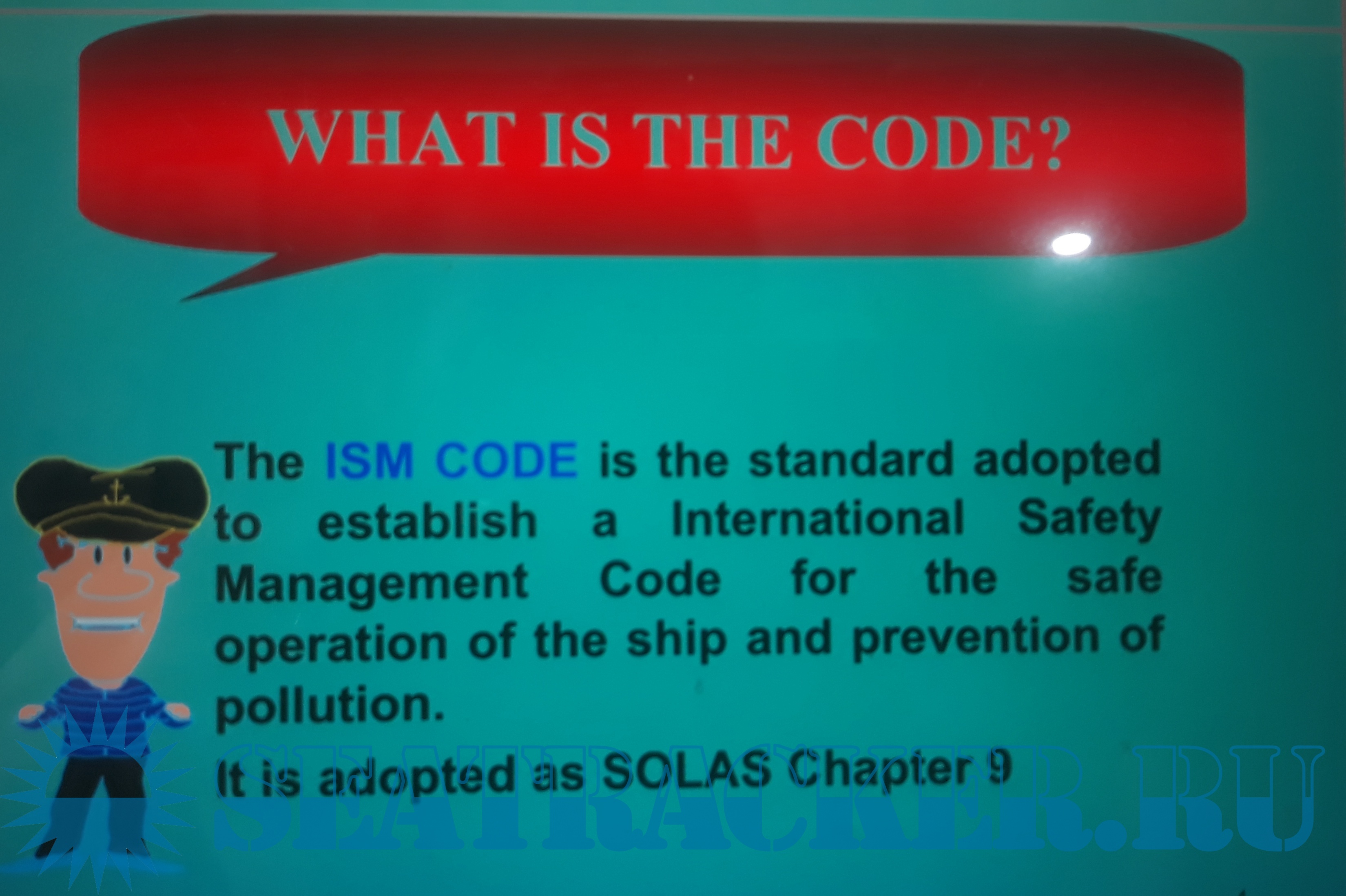 Description: The ISM CODE is the standard adopted to establish a International Safety Management Code for the safe operation of the ship and prevention of pollution. It is adopted as SOLAS Chapter 9