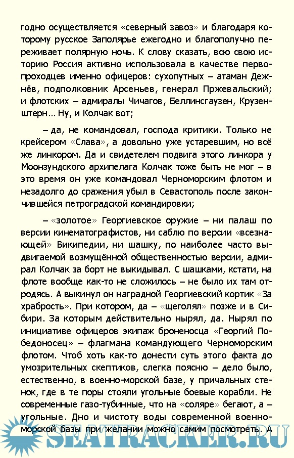 Описание: С точки зрения советской истории нет, пожалуй, в Белом движении фигуры более зловещей, чем фигура адмирала Колчака. Обвинений к нему множество и они столько лет звучали, что на слух воспринимаются, как нечто само собой разумеющееся, не требующее ни дополнительных доказательств, ни уж тем более опровержений. Ведь он английский шпион, правда? Укравший золотой запас империи, где-то потаённо ждущий своих наследников. Или давно потраченный и уж точно не на благое дело. Да и странный адмирал какой-то, о флотских подвигах которого ничего никому неизвестно, а вот о зверствах колчаковщины в Сибири и на Урале известно всем! А как он Сибирскую республику в крови потопил? Ну, не большевицкую, но ведь потопил же! То то!.. Он же во Владивосток аж из Америки приехал. Да в сопровождении высшего английского офицера. Пройдя кровавой дорогой до самой Уфы с сибирскими, а особенно амурскими казаками атамана Семёнова, творившими такое, что кровь стыла в жилах и при Колчаке, и после уж казни его, при отступлении семеновцев обратно в Приморье. Рабочих уральских заводов Колчак под угрозой смерти в бой гнал, а заводы стояли все. А снабжения своего белогвардейского фронта исключительно взятием в заложники семей паровозных бригад добился!
