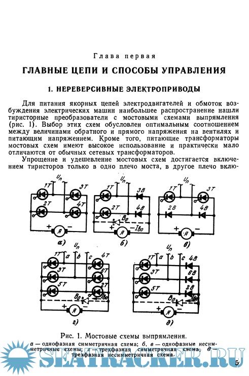 Описание: Описаны тиристорные преобразователи для электроприводов постоянного тока. Рассмотрены схемы выпрямления, защиты от перенапряжений и чрезмерных токов, охлаждение тиристоров. Изложены принципы управления тиристорами. Приведены примеры промышленных установок для возбуждения электрических машин и питания якорей двигателей постоянного тока