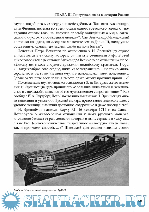 ОГЛАВЛЕНИЕ Введение Концепция правления Петра Великого (5). Рождение России как военно-морской державы (15). Становление Петра I как моряка и флотоводца к 1714 г.: начальный этап, бой 7 мая 1703 г., командование кораблями и эскадрами (27). Глава I Подготовка морской кампании 1714 года и поход русского корабельного и галерного флотов Замысел Петра I завершить войну со Швецией в 1714 г. (62). Подготовка корабельного и галерного флотов к кампании. Типы судов русского галерного флота: полугалеры и скампавеи (74). Объявление Санкт-Петербурга «царствующим градом» 8(19) мая 1714 г. перед выходом флота в море. Настроение россиян на победу (89). Поход корабельного флота к Ревелю, галерного к полуострову Гангут. Пётр I и генерал-адмирал Ф.М. Апраксин во главе Российского флота (93). Новый план кампании (106). Руководство Петра I действиями русских галер у полуострова Гангут. Переволока и знак Петра I на камне: загадки поиска (111). Прорывы русских галер у Гангута 26-27 июля 1714 г. (121). Глава II. Сражение при Гангуте Русские и шведы готовятся к сражению: состав шведского шхерного отряда Н. Эреншёльда, место баталии, артиллерийское вооружение кораблей, численность противников, распределение сил россиянами (139). «Благородный вымысел» в описании баталии Н. Эреншёльда (167). Сражение при Гангуте в изложении Й.А. Нурдберга (1740): литературные героико-эпические мотивы (170). Переговоры со шведами о сдаче без боя (173). Начало сражения: артиллерия вступает в дело (174). Отразили ли шведы две атаки россиян? (181) Проход русских галер в тыл шведам (182). Тактика русского галерного флота в баталии (185). Флотоводческое искусство Петра I (186). Потери сторон (188). Участники баталии (193). Награды (201). Последствия сражения при Гангуте в кампанию 1714 г. (206). Значение сражения при Гангуте в Великой Северной войне (211) флота (251). Корабли Российского флота, названные в честь победы, — традиции продолжаются (266). Памятники во славу морской виктории (273). Приложения № 1. 1714 г., после 27 июля. — Донесение шаутбенахта Нильса Эреншёльда адмиралу Г. Ваттрангу о исходе Гангутского сражения и положении пленных шведских офицеров (283); № 2. 1714 г. декабря 16. — Письмо Н. Эреншёльда Карлу XII об его пленении в Гангутском сражении и пребывании шведских пленных в Санкт-Петербурге (284); № 3. 1720 г. февраля 23. — «Сказка» о службе поручика Лефортовского пехотного полка Автомона Алексеева сына Весёлкина, участника Гангутского сражения (285); № 4. 1720 г. марта 1. — «Сказка» о службе капитана Лефортовского пехотного полка Саввы Спиридонова сына Мозалевского, участника Гангутского сражения (288); № 5. 1720 г., марта 2. — «Сказка» о службе подпоручика Лефортовского пехотного полка Саввы Петрова сына Матицына, участника Гангутского сражения (290); № 6. 1721 г. февраля 28. — «Сказка» о службе майора Ингерманландского пехотного полка Стефана Гаврилова сына Бакеева, участника Гангутского сражения, пленившего Н. Эреншёльда (292); № 7. 1722 г. января 29. — Письмо Н. Эреншёльда императору Петру Великому (294); № 8. Нурдберг И.А. Из сочинения «История Карла XII, короля Швеции» (295); № 9. Реконструкция композитором А.А. Фроловым музыки двух песен русских гвардейцев 1714 г. (298). Список сокращений Указатель имён Указатель географических названий Указатель наименований кораблей