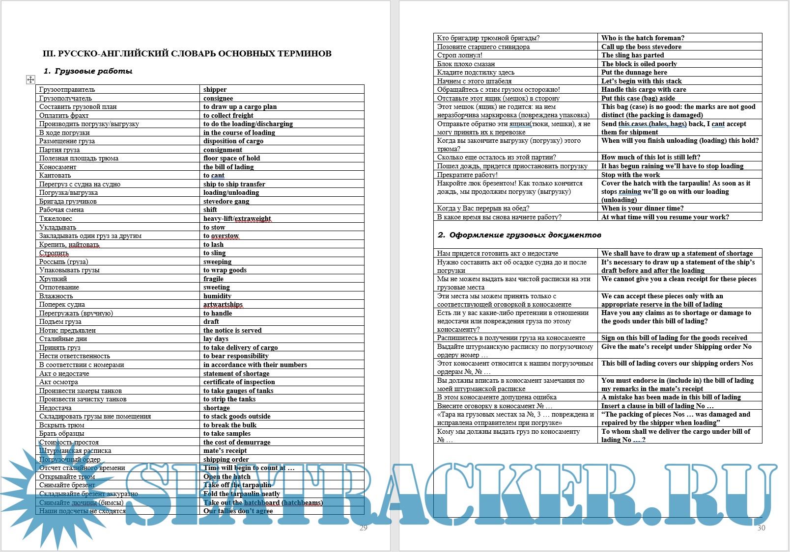 ВВЕДЕНИЕ I. Образцы деловых писем и документов капитана 1. Извещение капитана о готовности судна (нотис) 2. Письмо капитана о доставке документов, подтверждающих судовые расходы 3. Запрос справки о стомости спасенных сумм при заходе в порт без использования лоцмана, буксиров и отказа от услуг швартовщиков. 3.1. Пример справки о стомости спасенных сумм при заходе в порт без использования услуг швартовщиков 4. Об ускорении грузовых работ 4.1. О заказе сверхурочной работы 4.2. Об ускорении выгрузки (погрузки) 4.3. Об истечении сталийного времени 4.4. О выходе судна на демередж 5. Доверенности агенту 5.1. Письмо-доверенность агенту на подписание коносамента 5.2. Письмо-доверенность агенту на подписание Генерального акта. 6. Письма протеста при наличии претензий к качеству груза поданного к погрузке. 6.1. О плохой упаковке поданного к погрузке груза 6.2. Акт о непринятии груза в связи с подачей его в нетранспортабельной таре 6.3. О фумигации груза в трюмах 7. Письма протеста при претензии к количеству или качеству груза после выгрузки 7.1. Письмо-протест при недостаче груза после выгрузки 7.2. Письмо-протест против недостачи при определении количества груза в порту выгрузки по электронным весам 7.3. Письмо-протест против недостачи при неизвестности метода определения количества груза в порту выгрузки 7.4. О повреждении груза докерами 7.5. О хищении груза докерами 7.6. О повреждениях, нанесенных судну во время перегрузочных операций 7.7. Об окончании устранения поломок, произведенных при выгрузке 8. Пломбировка трюмов 8.1. Акт пломбировки 8.2. Акт распломбировки 8.3. Об отказе подписания акта распломбировки трюмов 8.4. О недостаче груза при пломбировке трюмов 9. Тальманство 9.1. О найме тальманов для счета груза 9.2. О недостаче груза и организации его пересчета 9.3. О ведении тальманского счета без взаимной кооперации 9.4. Об условиях работы тальманов 10. О морском протесте 10.1 Заявление о морском протесте 10.2. Примеры изложения обстоятельств морского протеста 10.3. Акт о морском протесте 11. Акт осадки судна II. Образцы писем-заявок, заказов, протестов 1. Заявка на снабжение судна водой 2. Заявка на водолазный осмотр судна 3. Заявка на поставку необходимых карт 4. Заявка на организацию ремонтных работ 5. Письмо агенту с просьбой получить разрешение портовых властей на ремонт главного двигателя 6. Заявка о направлении на судно сюрвейера 7. Письмо в случае разлива нефти при бункеровке 8. Письмо в случае попытки обвинить судно в загрязнении моря нефтью 9. Письмо капитану судна, с которым произошло столкновение 10. Письмо в ответ на письмо капитана иностранного судна об ответственности за столкновение 11. Письмо капитану иностранного судна после осмотра сюрвейера 12. Письмо капитану иностранного судна о передаче спора в морскую арбитражную комиссию (МАК) 13. Письмо агенту с требованием добиться задержания (ареста) иностранного судна, виновного в столкновении 14. Письмо агенту о навале судна на причал с просьбой пригласить сюрвейера 15. Письмо, подтверждающее окончание устранения нанесенных повреждений III. Русско-английский словарь основных терминов 1. Грузовые работы 2. Оформление грузовых документов 3. Оговорки коносамента 4. Ремонт 5. Наиболее употребляемые названия судового оборудования, инвентаря, инструментов, материалов, частей механизмов и т.д. 6. Контейнер 24