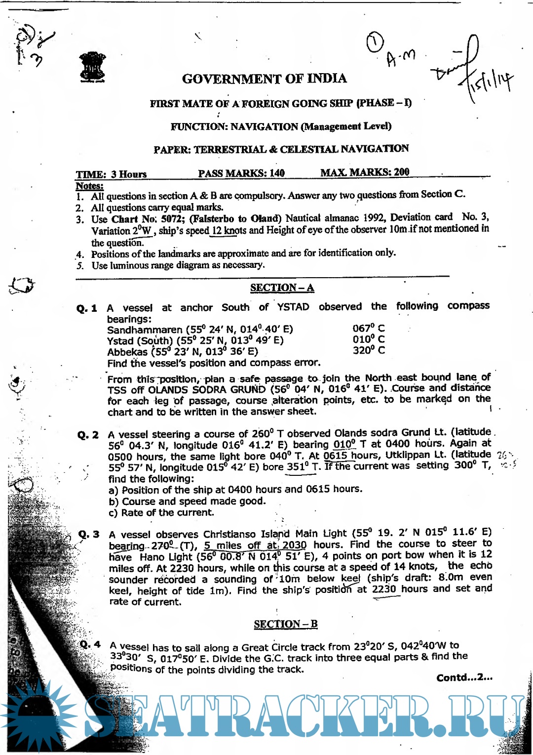 Description: Question Paper Set for Phase I (Chief Mate F.G.) Mercantile Marine Department (MMD), India Examinations.