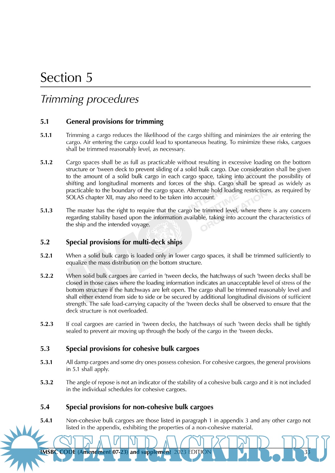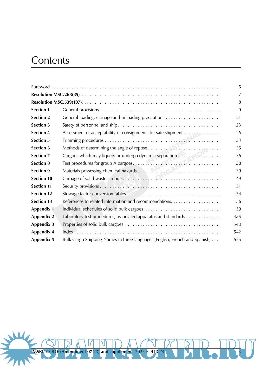 Description: The primary aim of the International Maritime Solid Bulk Cargoes Code (IMSBC Code), which replaces the Code of Safe Practice for Solid Bulk Cargoes (BC Code), is to facilitate the safe stowage and shipment of solid bulk cargoes by providing information on the dangers associated with the shipment of certain types of solid bulk cargoes and instructions on the procedures to be adopted when the shipment of solid bulk cargoes is contemplated. The IMSBC Code, adopted on 4 December 2008 by resolution MSC.268(85), entered into force on 1 January 2011, from which date it was made mandatory under the provisions of the SOLAS Convention. The Code has been amended by resolutions adopted by the Maritime Safety Committee, the most recent being resolution MSC.539(107), incorporating Amendment 07-23, which may be applied from 1 January 2024 on a voluntary basis, and has an official entry into force on 1 January 2025.