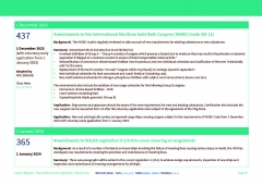 Description: Upcoming changes to mandatory statutory regulations and instruments, Including adopted amendments entering into force on or after 1 November 2023, requirements which have entered force but are phasing in for some ships, and significant developments up to and including the Carriage of Cargoes and Containers Sub-Committee (CCC 9) in September 2023.