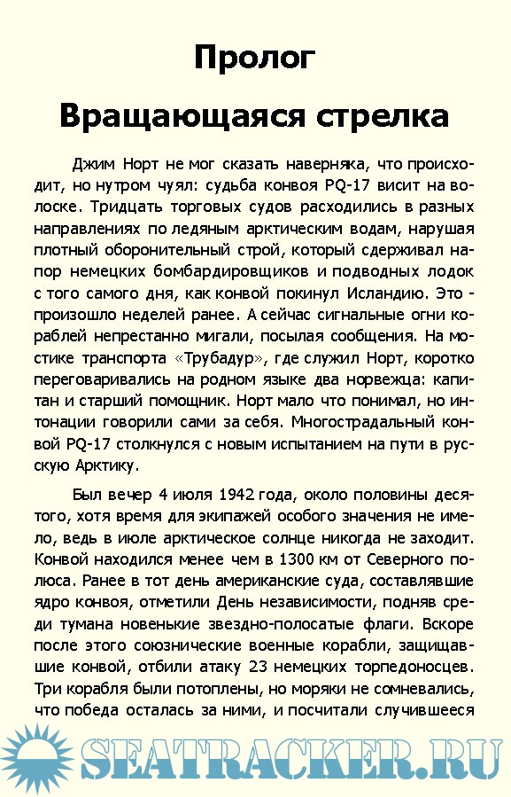 В 1941 году в Архангельск прибыл первый арктический конвой, отправленный в СССР союзниками — Великобританией и США. Его судьба сложилась удачно, в отличие от другого конвоя — печально знаменитого PQ-17. Предыстории, злоключениям и последствиям плавания этого каравана посвящена книга Уильяма Жеру.