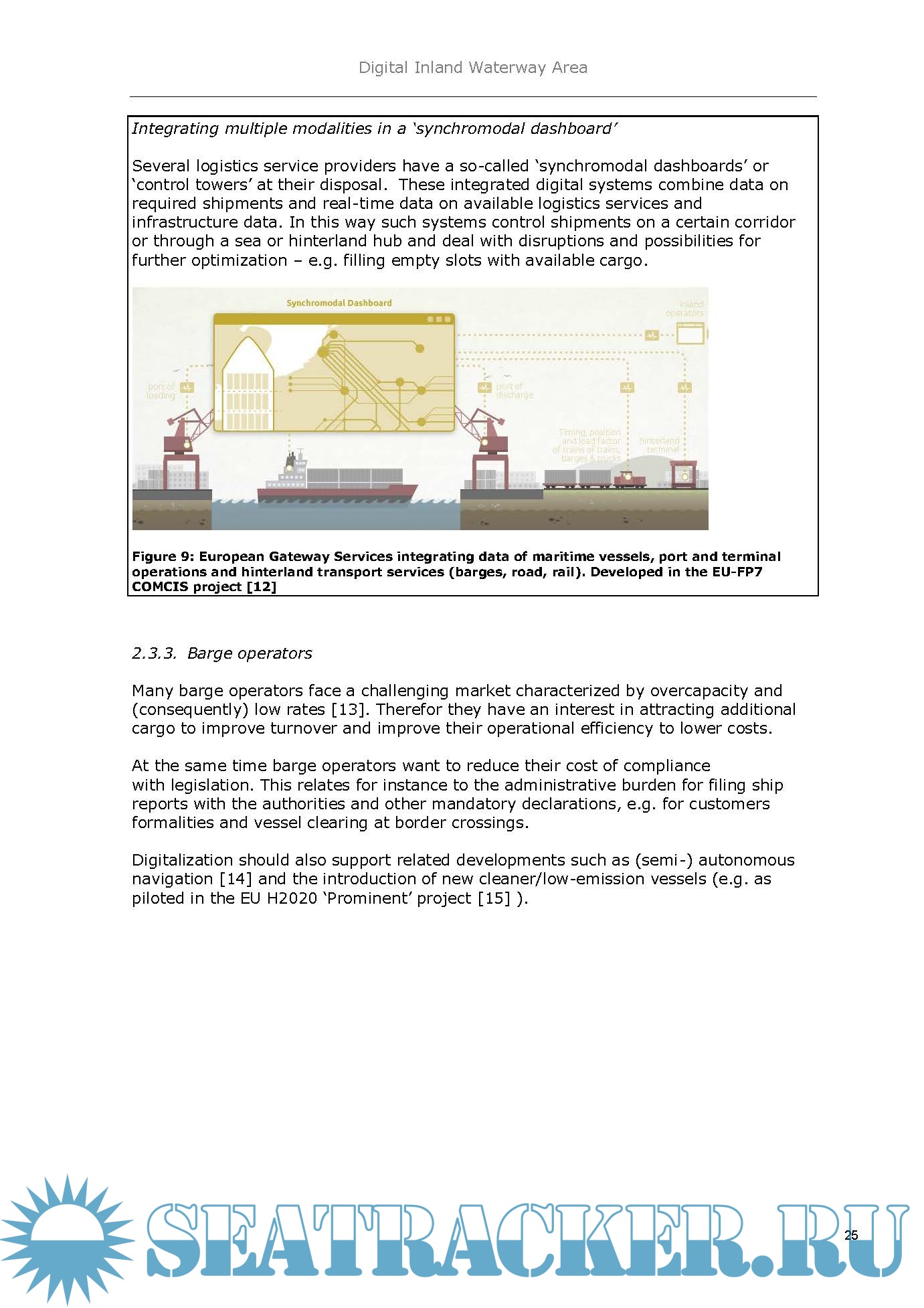 Description: This report is the result of a study on the future digitalization of inland waterway transport. Digitalization is affecting many sectors and industries. In transport and logistics the use of digital technologies is essential to streamline business processes between shippers and logistics actors. Several modes of transport have adopted different kinds of intelligent transport systems and are investigating the possibility of using (semi-)autonomous vehicles. Rapid technological developments have reduced the implementation barriers for such approaches. Public authorities are responded by providing the necessary regulatory frameworks and through specific digitalization initiatives. In a European context this includes the Digital Single Market initiative and the Digital Transport & Logistics Forum.