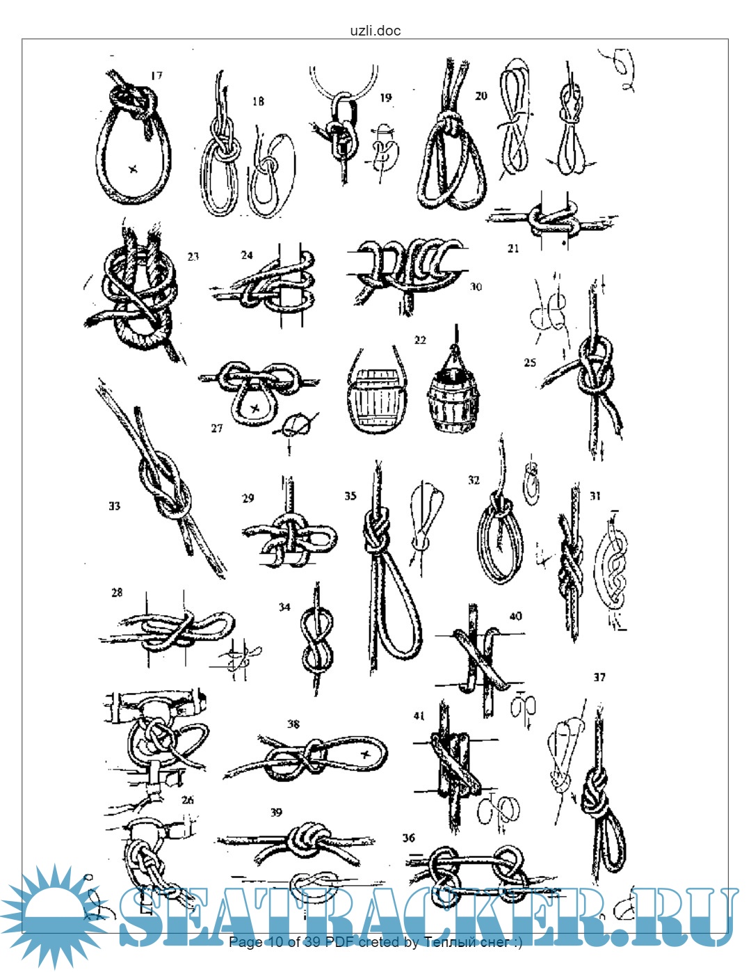 Год выпуска: 20XX Язык: русский Автор: YurikGL Издательство: : библиотека Туристско-Спортивного Союза Республики Башкортостан Формат: PDF Качество: Изначально компьютерное (eBook) Количество страниц: 39 Описание: Техника вязки узлов берет свое начало с незапамятных времен. Самые древние узлы были найдены в Финляндии, они датируются неолитом (поздним каменным веком). Несомненно, узлы вились людьми и раньше, но, к сожалению, не сохранились. Гибкие материалы были основным крепежным подспорьем, работая с которыми человек создавал изделия труда, оружие и различные приспособления. Помимо прямого применения, узлы становятся основным элементом для большой группы изделий декоративно-прикладного характера. На рубеже каменного и бронзового веков выделяется своеобразное искусство вязки узлов и плетений. Появляются особые узлы, имеющие культовое значение (группа священных узлов).