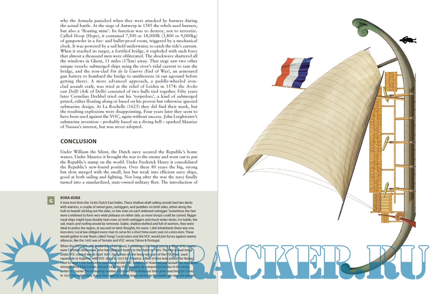 On the high seas the fleet carved out a new empire, growing national income to such levels that it could continue the costly war for independence. Yet it was in coastal and inland waters that the most decisive battles were fought. Arguably the most decisive Spanish siege (Leiden, 1574) was broken by a fleet sailing to the rescue across flooded polders, and the battle of Nieuwpoort in 1600, the largest successful invasion fleet before World War II, was one of the most decisive battle in western history. Using detailed full colour artwork, this book shows how the Dutch navies fought worldwide in their war of independence, from Brazil to Indonesia, and from the Low Countries to Angola.