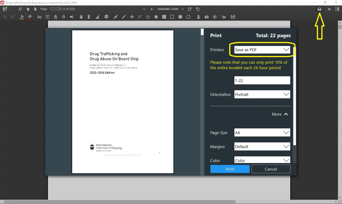 There is an option to print in the updated version of Navstation Library. Print to pdf. Restriction is there for printing 10% of the book only in one day.