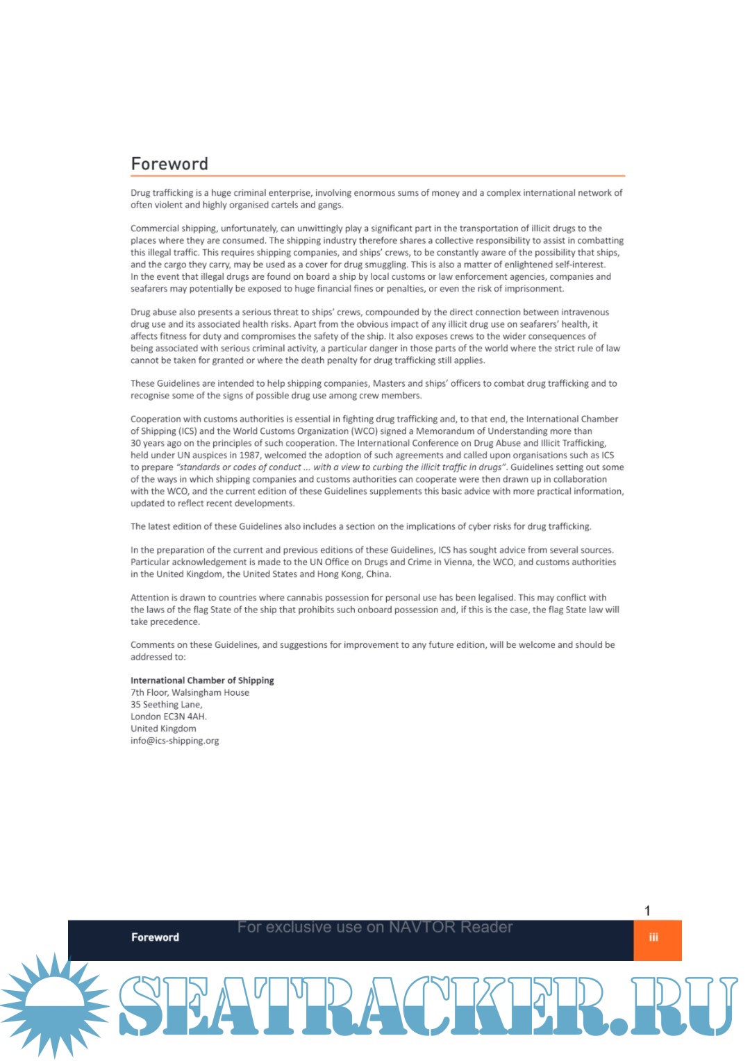 Year: 2023/2024 Language: english Author: International Chamber of Shipping (ICS) Genre: Guide Publisher: International Chamber of Shipping Edition: 6th ISBN: 978-1-914993-19-0 Format: PDF Quality: OCR with errors Pages count: 213 Description: This publication provides guidance on how to combat drug trafficking at sea and to recognise the signs of drug use and dependence among crew members. Considered the leading industry publication on the topic, this 6th edition has been fully updated by industry experts to assist shipping companies, Masters and officers, to help prepare, prevent, protect and how to respond when faced with drug trafficking and drug abuse at sea. Drug trafficking is undertaken by sea because of the opportunities presented for high volume movements from producing to consuming countries. Commercial shipping, unfortunately, can unwittingly play a significant part in the transportation of illicit drugs to the places where they are consumed. The shipping industry therefore shares a collective responsibility to assist in combatting this illegal traffic. This requires shipping companies, and ships’ crews, to be constantly aware of the possibility that ships, and the cargo they carry, may be used as a cover for drug smuggling. Drug abuse also presents a serious threat to ships’ crews, compounded by the direct connection between intravenous drug use and its associated health risks. It also exposes crews to the wider consequences of being associated with serious criminal activity, a particular danger in those parts of the world where the strict rule of law cannot be taken for granted or where the death penalty for drug trafficking still applies. The guidance contained in this publication demonstrates how to protect the ship and the crew and reduce the risk of drug trafficking occurring on board. Additional info: Guidelines for Owners and Masters on Preparation, Prevention, Protection and Response.