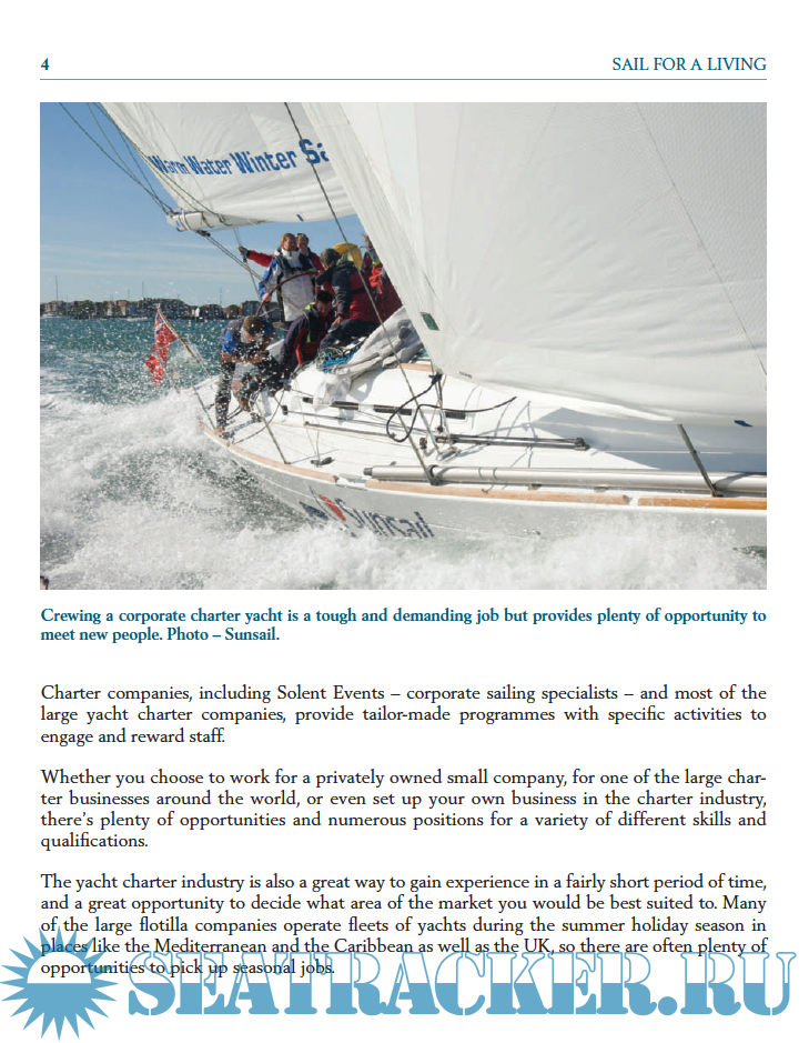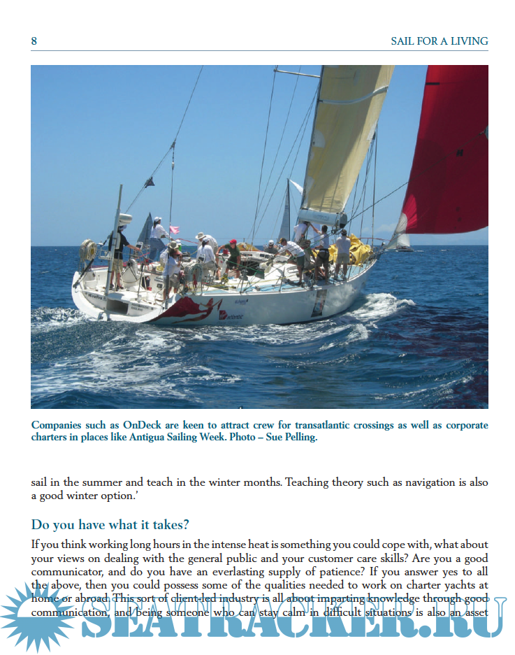 Year: 2011 Language: English Author: Sue Pelling Publisher: Wiley Nautical ISBN: 978-1-119-95254-1 Format: PDF Quality: OCR without errors Pages count: 197 Description: Sail for a Living will help those with an interest in sailing and the sea to escape that nine- tofi ve monotony and realise what options are available. There’s advice from a wealth of industry experts who have learned the hard way and are happy to share their experiences. Information on career paths and qualifi cations are mixed with practical tips and words of warning. It is written by someone with personal experience of switching careers into the marine industry, and aims to give an honest insight in to how to make the change and to do so successfully. While quitting a well- paid job for a more ‘fun’ occupation could, on the surface, be seen to be naïve and irresponsible, the long- term benefi ts – including health, lifestyle and peace of mind – often outweigh the reasons to stay. You need, however, to plan your new career carefully and avoid common mistakes which could jeopardise your success.