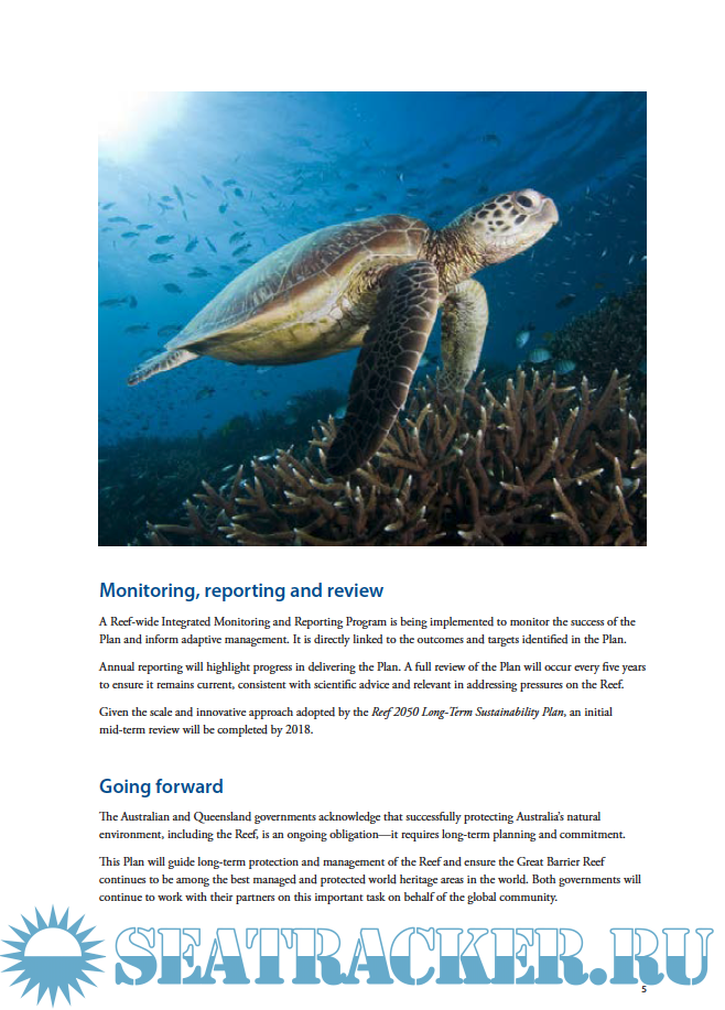 Year: 2015 Language: English Author: Commonwealth of Australia Genre: Practical guide Publisher: Commonwealth of Australia Format: PDF Quality: OCR without errors Pages count: 111 Description: Australians are passionate about the Great Barrier Reef. It is one of the world’s greatest natural assets. Our vision is to ensure the Great Barrier Reef continues to improve on its Outstanding Universal Value every decade between now and 2050 to be a natural wonder for each successive generation. Traditional Owners have cared for the Reef for thousands of years and Australia is committed to its ongoing protection. The Reef 2050 Long-Term Sustainability Plan is based on science and the lessons learnt from managing the Reef over the past four decades.