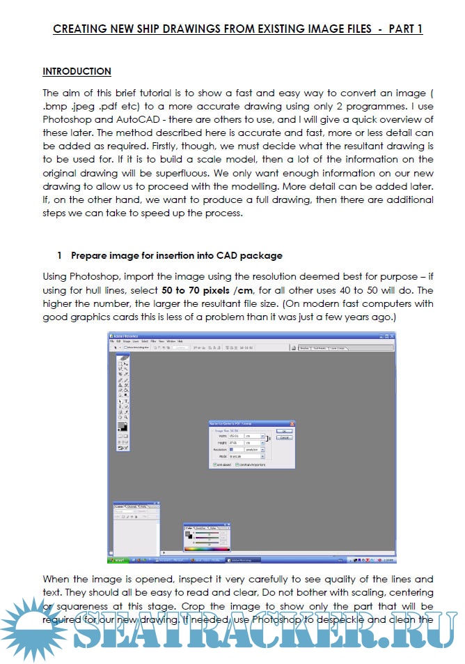 Description: The aim of this brief tutorial is to show a fast and easy way to convert an image (.bmp .jpeg .pdf etc) to a more accurate drawing using only 2 programmes. I use Photoshop and AutoCAD - there are others to use, and I will give a quick overview of these later. The method described here is accurate and fast, more or less detail can be added as required. Firstly, though, we must decide what the resultant drawing is to be used for. If it is to build a scale model, then a lot of the information on the original drawing will be superfluous. We only want enough information on our new drawing to allow us to proceed with the modelling. More detail can be added later. If, on the other hand, we want to produce a full drawing, then there are additional steps we can take to speed up the process.