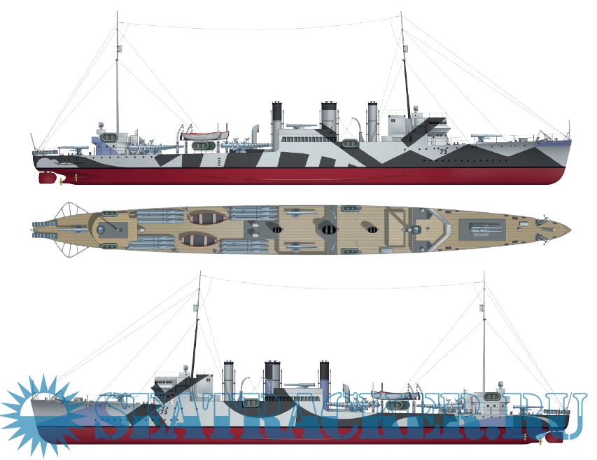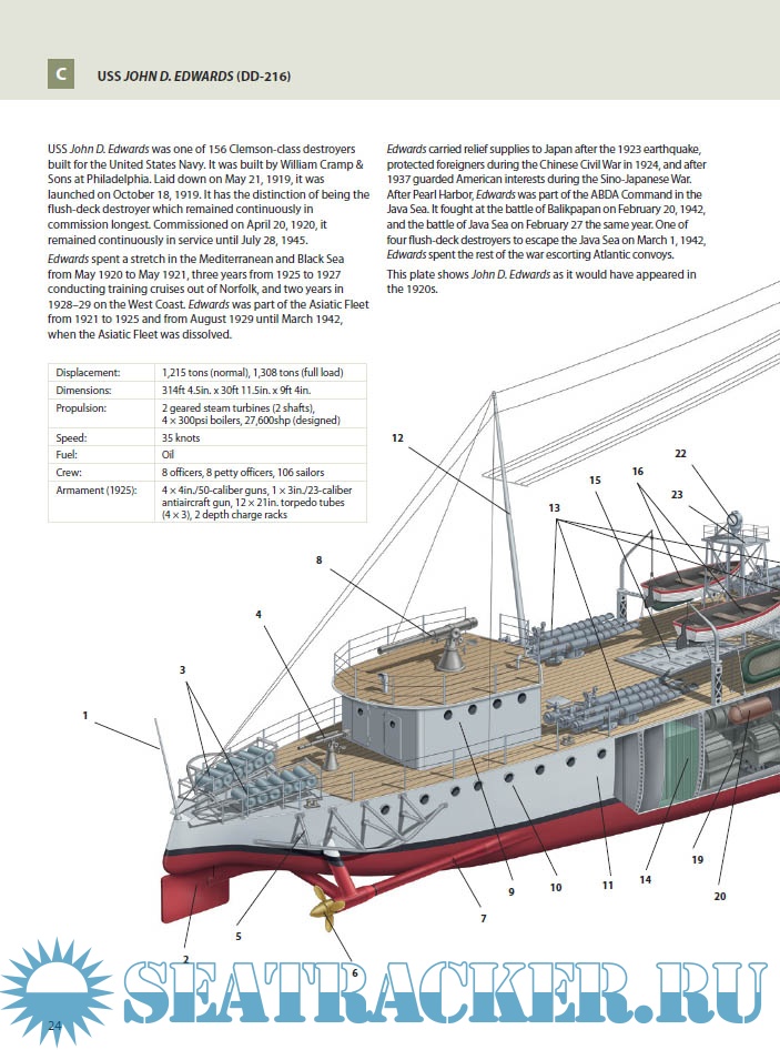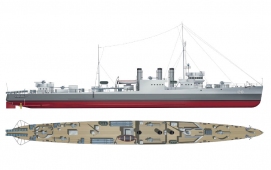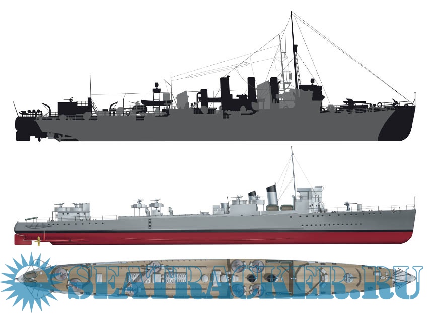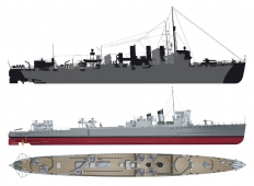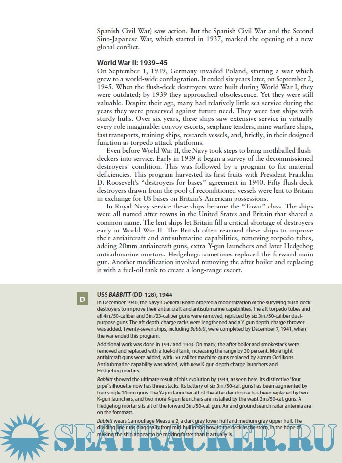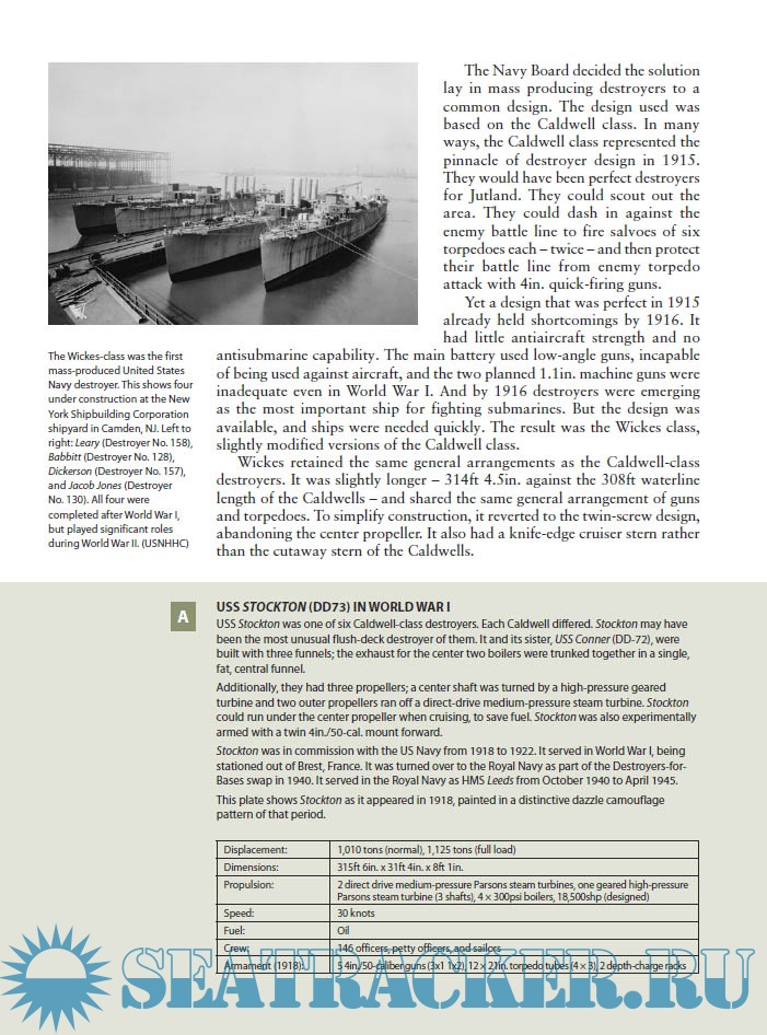 Описание: Four pipes and flush decks--these ships were a distinctively American destroyer design. Devised immediately prior to and during the United States' involvement in World War I they dominated the US Navy's destroyer forces all the way through to World War II.