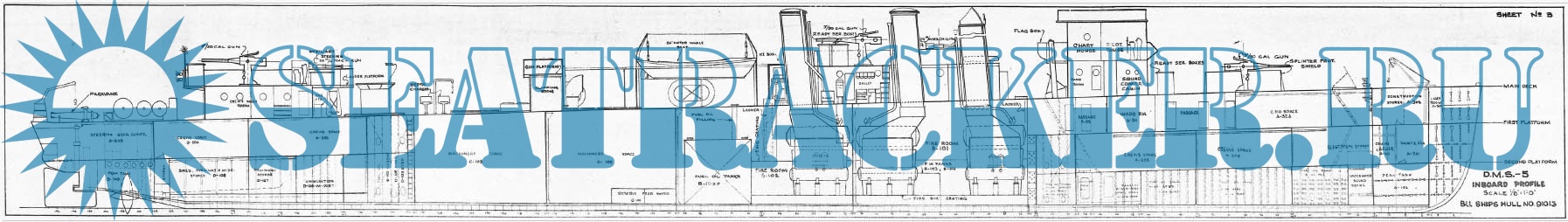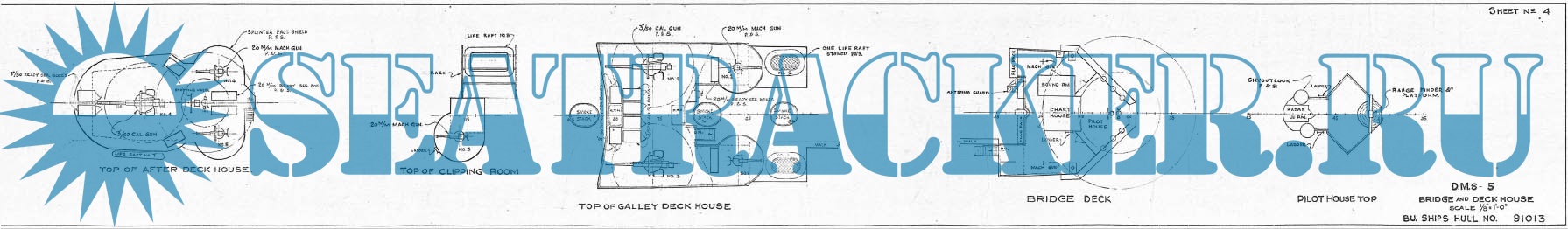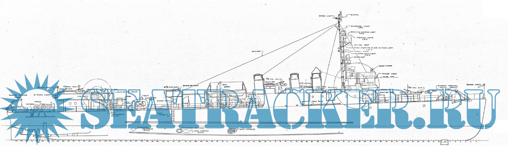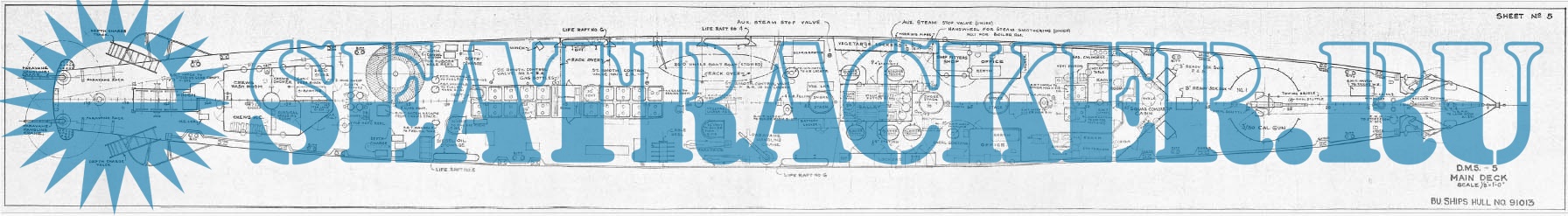 Описание: 8 листов чертежей эсминца США DMS-5 (ex DD-161) - USS Palmer (тип «Wickes») на 1943 год.