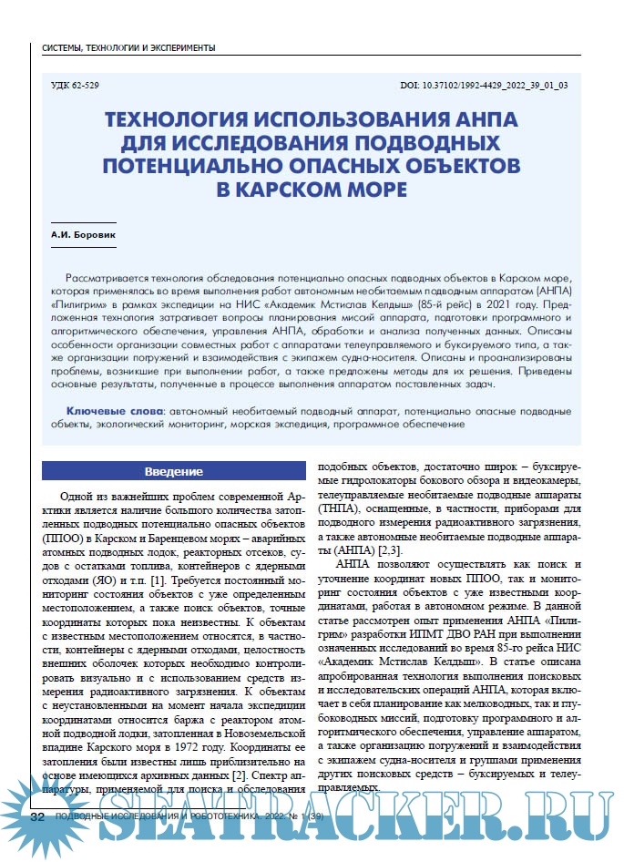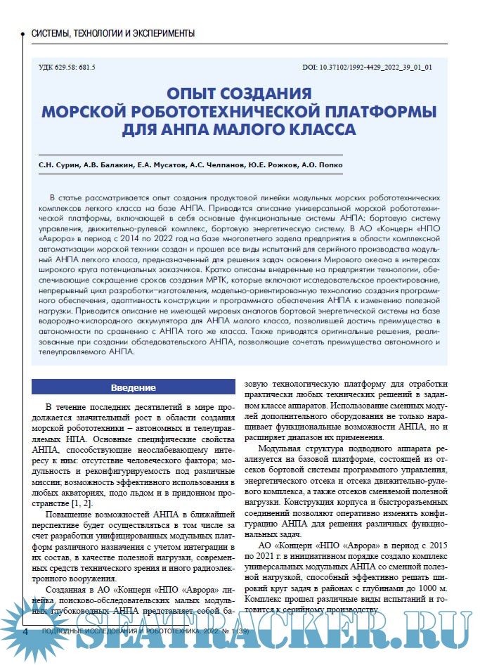 Описание: Научно-технический журнал «Подводные исследования и робототехника» посвящен проблемам исследования и освоения Мирового океана и относится к области знаний, лежащей на стыке наук:- теоретической и прикладной механики, навигации и управления движением, динамики управляемых систем и процессов,- робототехники, мехатроники, автоматизированного конструирования технических устройств, информатики и вычислительной техники,- теоретической и прикладной океанографии, физики океана, гидроакустики, морской геологии, экологии морских акваторий.Цель журнала – систематизировать и объективно отражать все наиболее значимые научно-технические и практические достижения и результаты исследований по освоению подводного пространства и морского дна, способствовать развитию новых идей, средств и методов подводных исследований и робототехники, консолидировать усилия научных и деловых кругов, потенциальных потребителей новейших достижений в сфере подводных технологий.Журнал «Подводные исследования и робототехника» публикует научно-технические статьи, проблемные, обзорные, дискуссионные материалы по всем направлениям, относящимся к методам и техническим средствам исследования и освоения океана, включая подводные аппараты и роботы, акустические, гидрологические, геофизические средства и методы исследования физических полей океана.Авторами публикаций журнала являются авторитетные ученые, ведущие специалисты и молодые исследователи из научных организаций и вузов Москвы и Подмосковья, Санкт-Петербурга, Зарубежья, Дальнего Востока, Урала, Сибири, и других регионов России. Для научного рецензирования и редактирования публикуемых статей привлекаются авторитетные специалисты в соответствующих областях знаний.Читательская аудитория - широкий круг ученых и специалистов, работающих в области исследования морских глубин, деловые круги и потенциальные потребители научно-технических разработок и инновационных проектов, молодые ученые, аспиранты и студенты, специализирующаяся в указанной области.