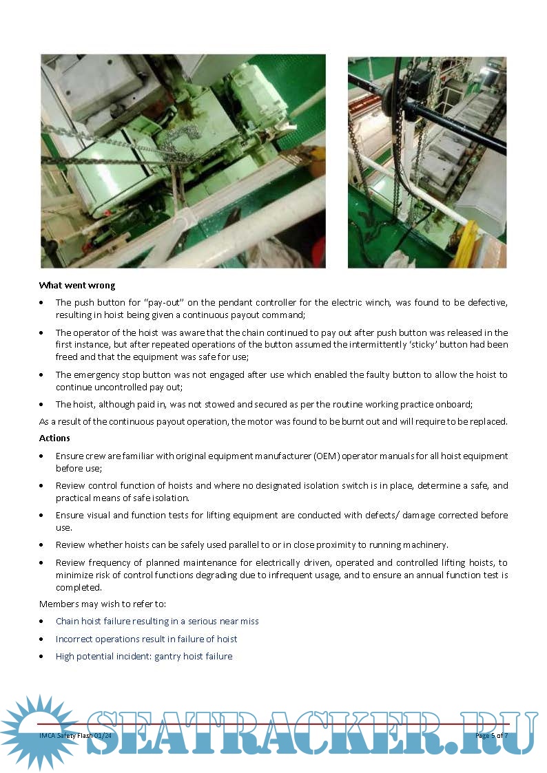 IMCA SF 01/24 • Diver in the bell hit by falling object • Divers lifted off seabed by Clump Weight • Leak in hot water system for saturation divers • Chain hoist paid out unsupervised near running main engine • MAIB: Workboat collision with wind turbine platform