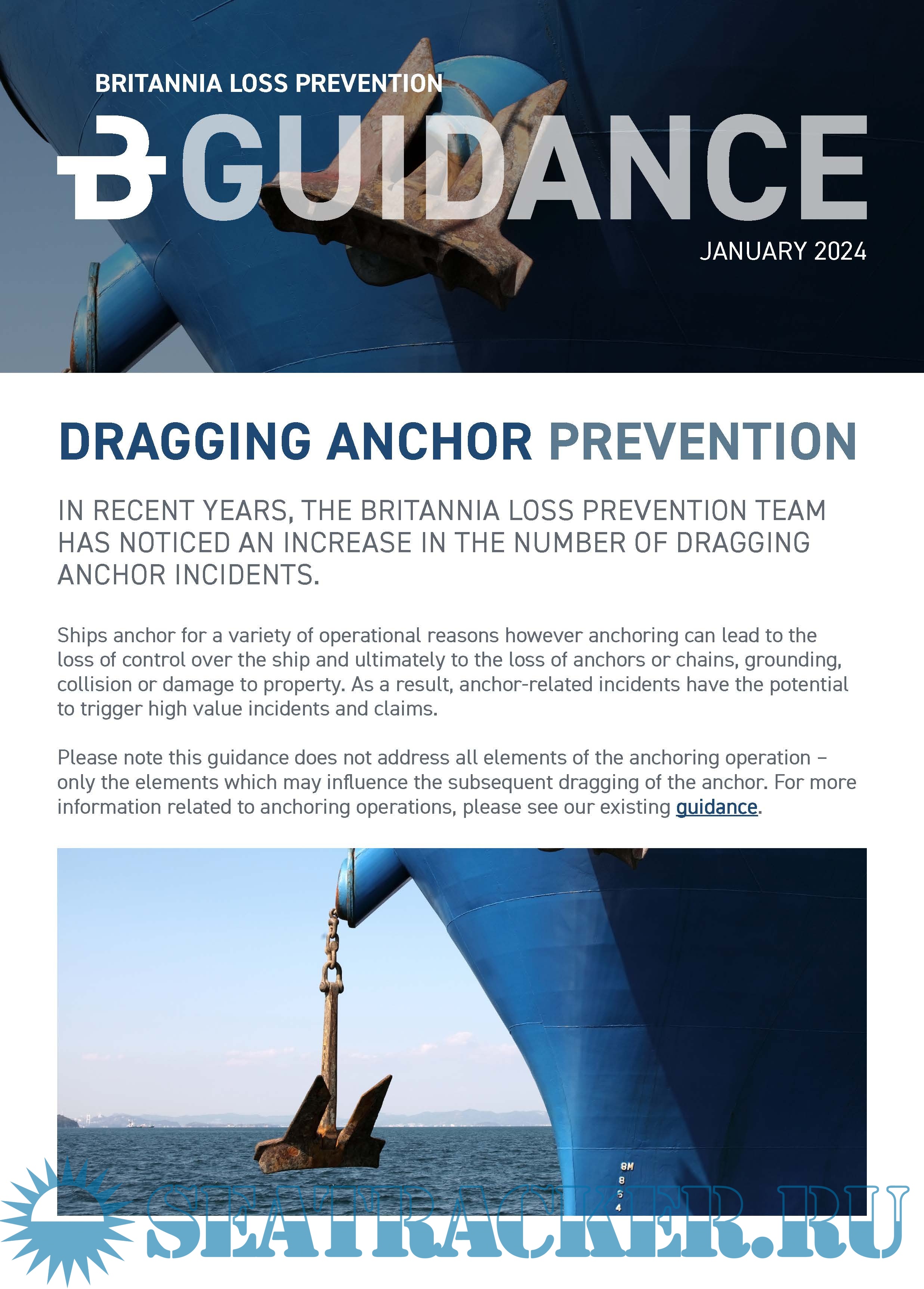 Year: 2024 Language: English Author: Britannia P&I Club Genre: Guide Edition: 09 January 2024 Format: PDF Quality: eBook Pages count: 9 Description: In recent years, the Britannia Loss Prevention team has noticed an increase in the number of dragging anchor incidents. Ships anchor for a variety of operational reasons however anchoring can lead to the loss of control over the ship and ultimately to the loss of anchors or chains, grounding, collision or damage to property. As a result, anchor-related incidents have the potential to trigger high value incidents and claims. Please note this guidance does not address all elements of the anchoring operation – only the elements which may influence the subsequent dragging of the anchor.