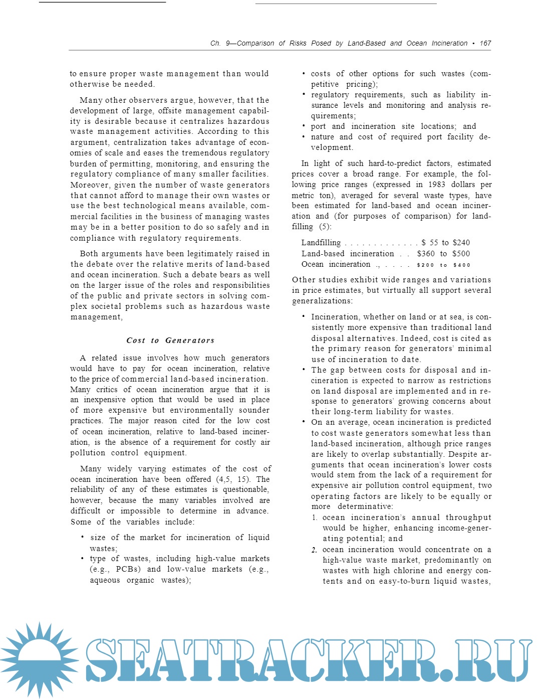 Year: 1986 Language: English Author: Anne Meadows Genre: Technical book Format: PDF Quality: Scanned pages Pages count: 219 Description: This assessment of ocean incineration includes consideration of the adequacy of regulations; risks to human health and the marine environment relative to the risks of comparable activities; existing and emerging alternatives; the capabilities and limitations of ocean incineration in managing hazardous wastes; and how its use might affect efforts to develop superior waste treatment and reduction practices.