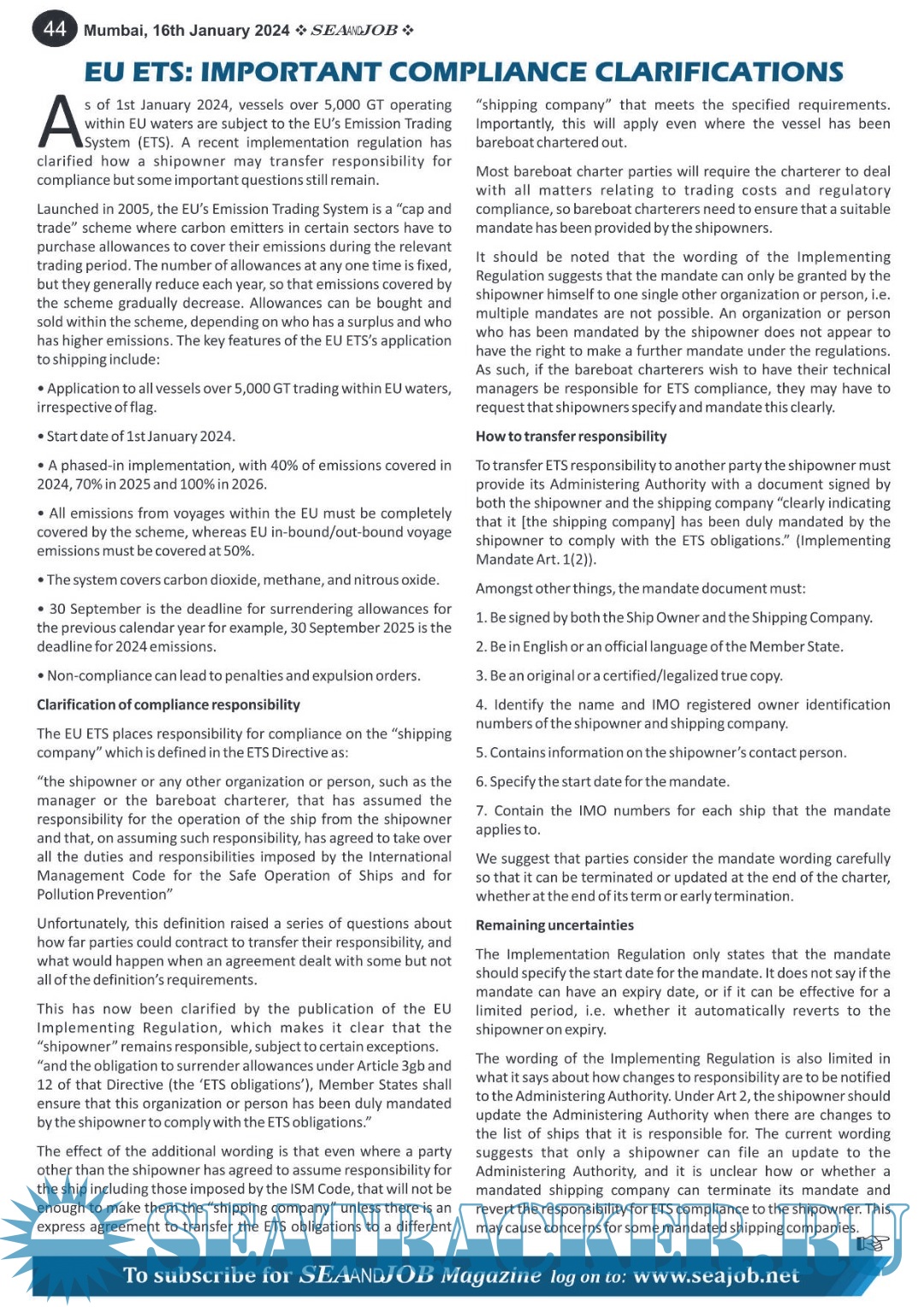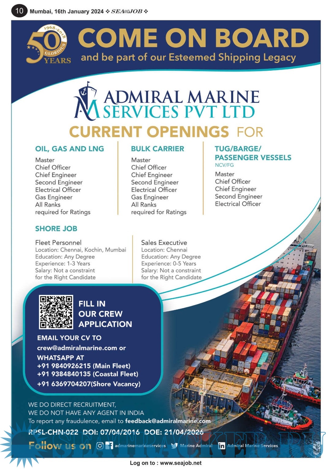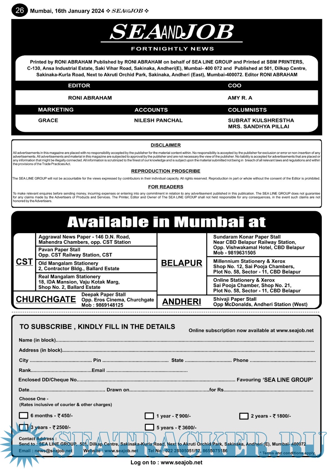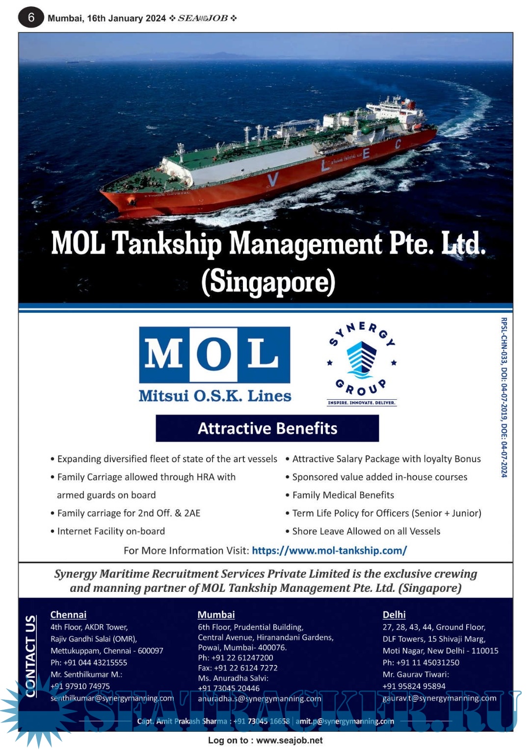 Description: The Sea and Job magazine launched in May 2007, was the second venture of Sea Line Group succeeding 'seajob.net' bringing the much renowned essence to the Group, the Sea and Job Magazine quickly gained popularity, becoming the No. 1 Shipping Magazine that came to be widely circulated all over India. Sea and Job over the years has evolved as the most trusted, ethical, objective and read maritime publication that possesses a large database of subscribers from various verticals in the industry.The magazine provides informative and interesting articles covering not just the shipping world but also the world outside it.Sea and Job is also a medium for the shipping/ manning companies to advertise marine jobs and also to promote their organization by publicizing internal activities like seminars, sports events and parties.Some notable endeavors of the magazine include the Know Your Recruiter Column, the Sailing Episodes Column and the Marine Insights section. The consistent efforts and the dedication to provide extraordinary services to the industry has resulted in the magnifying popularity and patronage of Sea and Job.