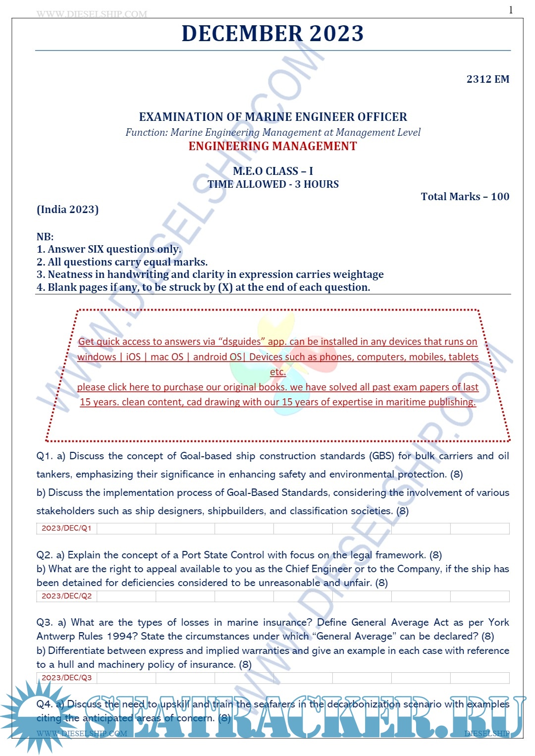 Year: 2023 Language: English Author: Dieselship Format: PDF Quality: eBook Pages count: 143 Description: M.E.O. Class I Question Paper set for Mercantile Marine Department (MMD), D.G. Shipping India Exams.