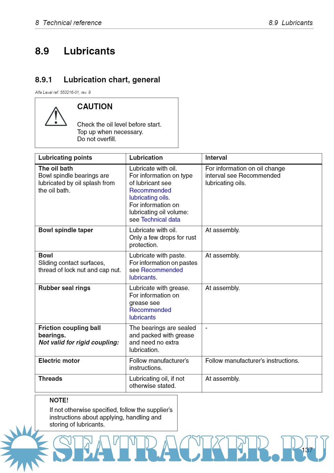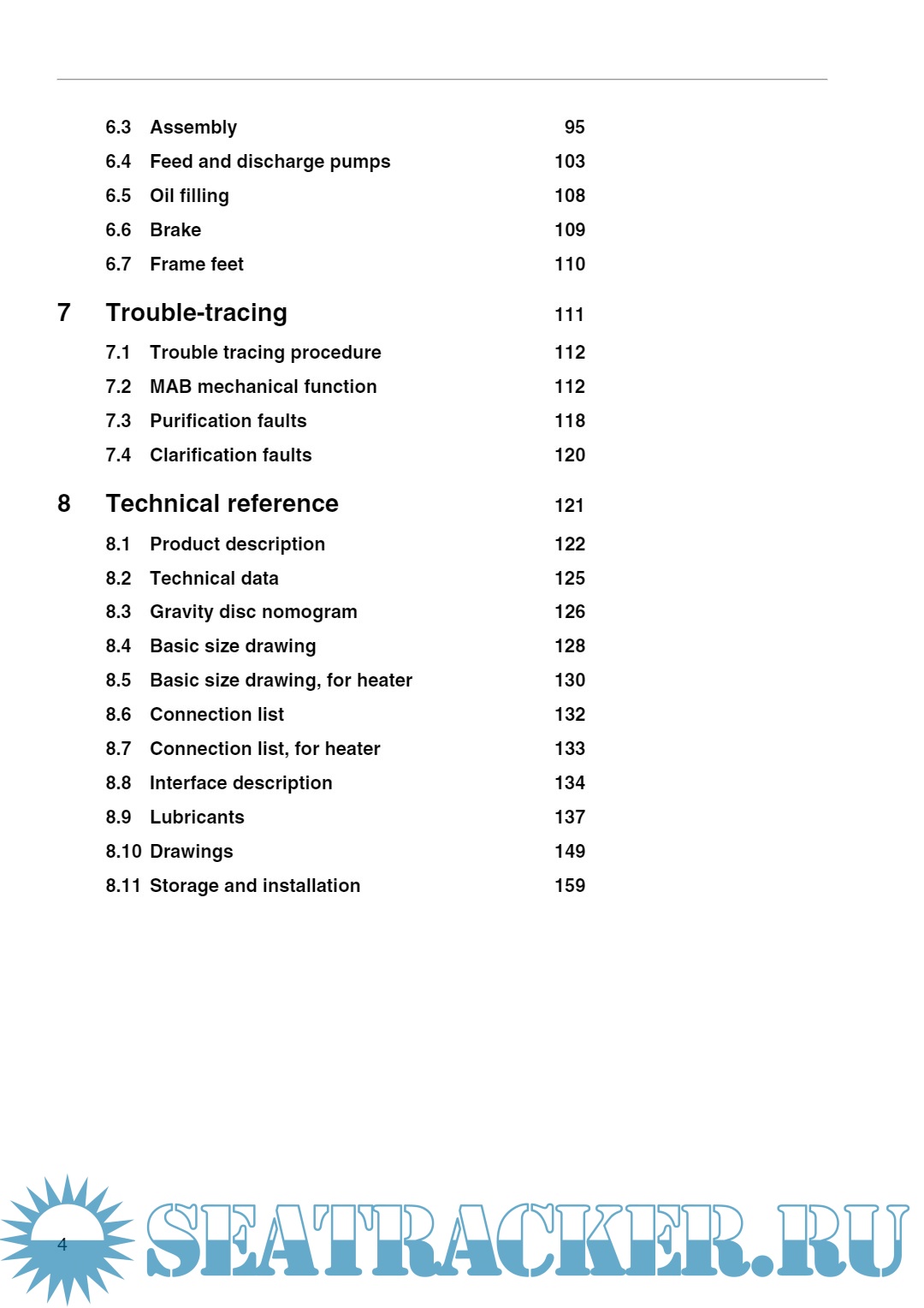 Year: 2019 Language: English Author: Alfa Laval Tumba AB Genre: Manual Publisher: Alfa Laval Tumba AB Format: PDF Quality: eBook Pages count: 164 Description: This manual is designed for operators and service engineers working with the Alfa Laval separator MAB 103B-24. For information concerning the function of the separator, see ‘‘3 Separator basics” on page 17, and ‘‘4 Operating instructions” on page 31. If the separator has been delivered and installed by Alfa Laval as part of a processing system, this manual is a part of the System Manual. In this case, study carefully all the instructions in the System Manual. In addition to this Separator manual a Spare Parts Catalogue, SPC is supplied. This Separator manual consists of: Safety instructions Pay special attention to the safety instructions for the separator. Not following the safety instructions can cause accidents resulting in damage to equipment and serious injury to personnel. Separator basics Read this chapter if you are not familiar with this type of separator. Operating instructions This chapter contains operating instructions for the separator only.