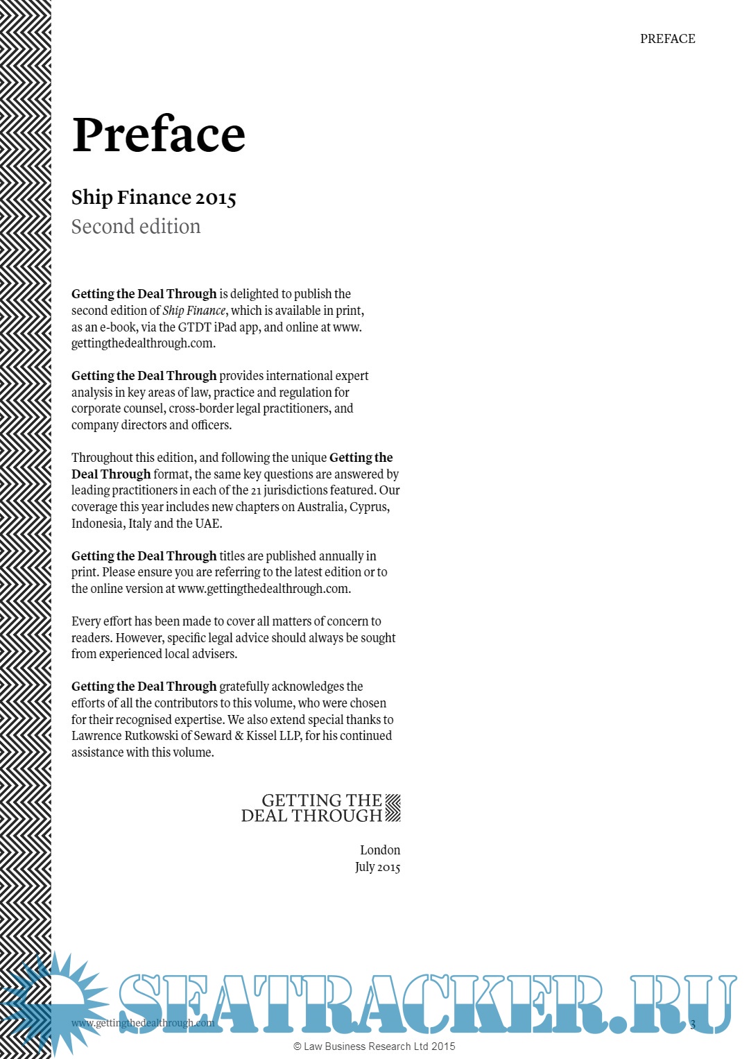 Year: 2015 Language: English Author: Lawrence Rutkowski Genre: Handbook Publisher: Gideon Roberton Edition: Second Edition ISBN: 2056-4015 Format: PDF Quality: eBook Pages count: 121 Description: Getting the Deal Through is delighted to publish the second edition of Ship Finance, which is available in print, as an e-book, via the GTDT iPad app, and online at www.gettingthedealthrough.com. Getting the Deal Through provides international expert analysis in key areas of law, practice and regulation for corporate counsel, cross-border legal practitioners, and company directors and officers. Throughout this edition, and following the unique Getting the Deal Through format, the same key questions are answered by leading practitioners in each of the 21 jurisdictions featured. Our coverage this year includes new chapters on Australia, Cyprus, Indonesia, Italy and the UAE. Getting the Deal Through titles are published annually in print. Please ensure you are referring to the latest edition or to the online version at www.gettingthedealthrough.com. Every effort has been made to cover all matters of concern to readers. However, speciʩc legal advice should always be sought from experienced local advisers. Getting the Deal Through gratefully acknowledges the efforts of all the contributors to this volume, who were chosen for their recognised expertise. We also extend special thanks to Lawrence Rutkowski of Seward & Kissel LLP, for his continued assistance with this volume.