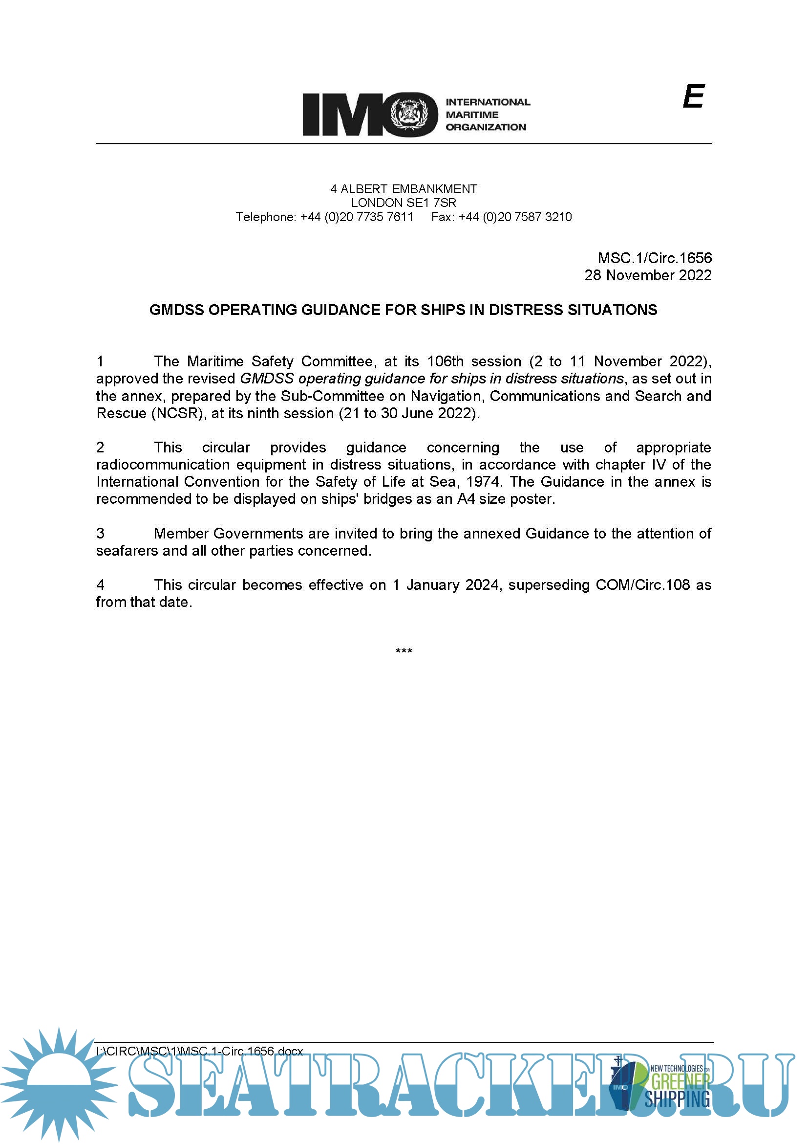 Description: This circular provides guidance concerning the use of appropriate radiocommunication equipment in distress situations, in accordance with chapter IV of the International Convention for the Safety of Life at Sea, 1974.