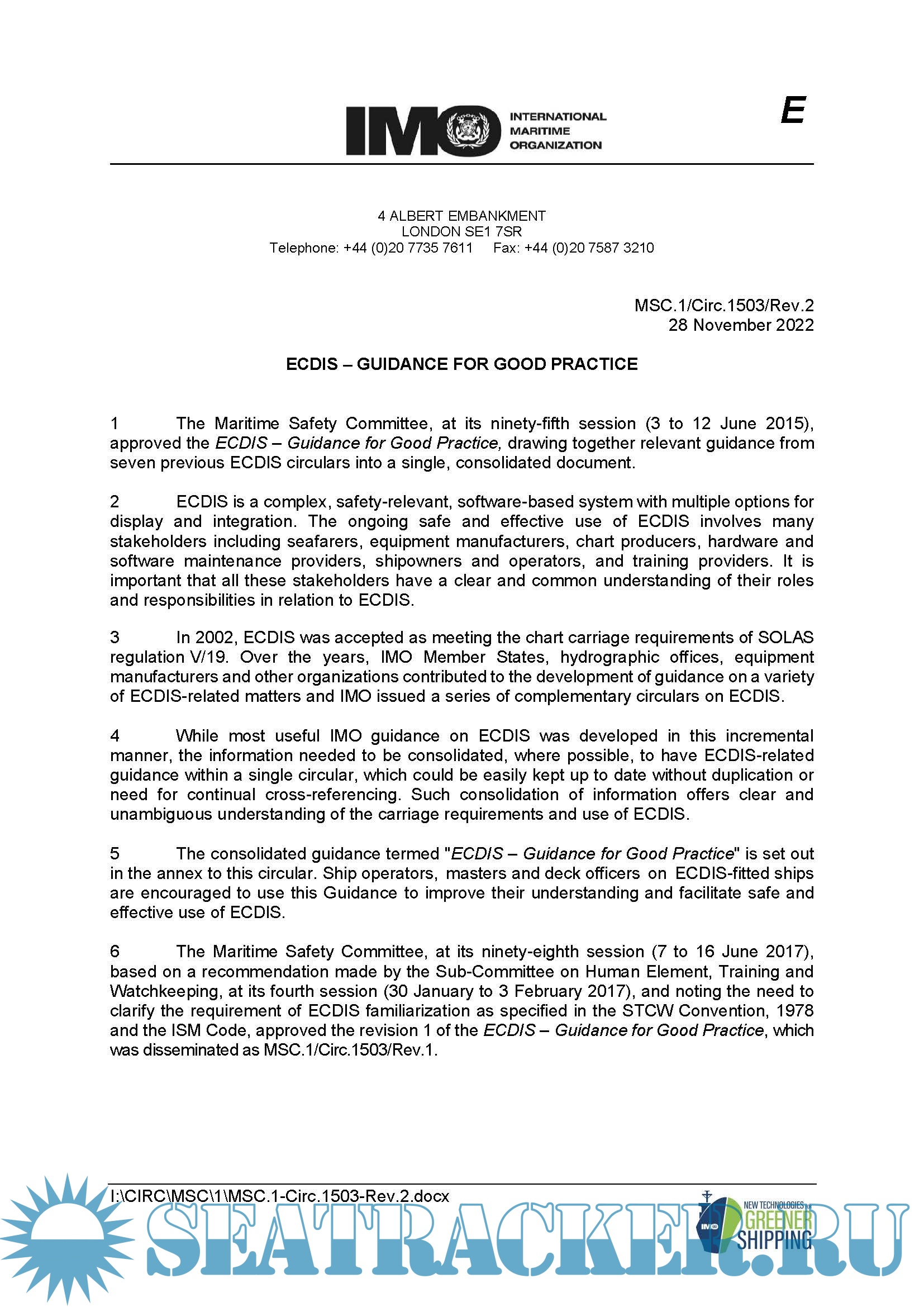 Description: IMO MSC.1-Circ.1503-Rev.2 ECDIS Guidance for Good Practice. The consolidated guidance termed "ECDIS - Guidance for Good Practice" is set out in the annex to this circular. Ship operators, masters and deck officers on ECDIS-fitted ships are encouraged to use this Guidance to improve their understanding and facilitate safe and effective use of ECDIS.